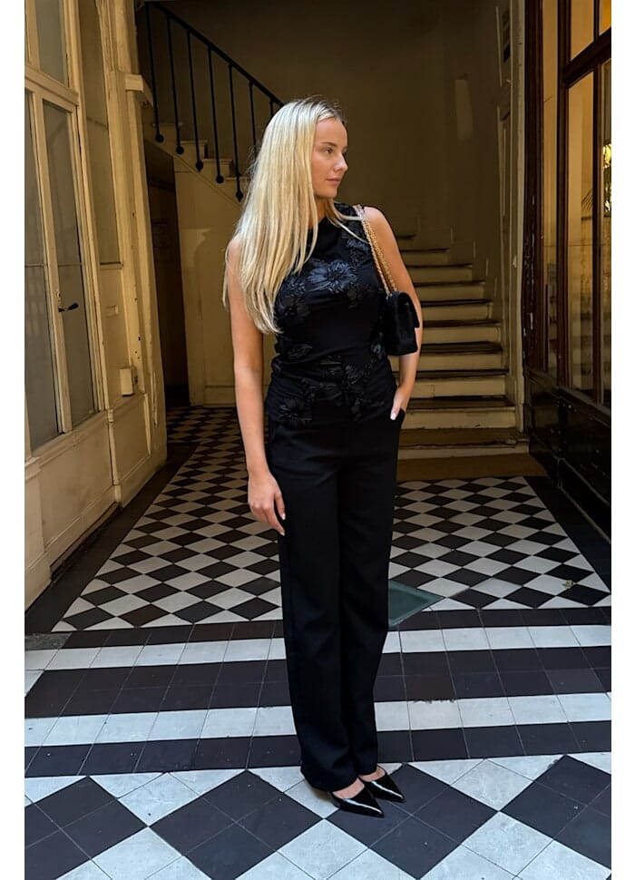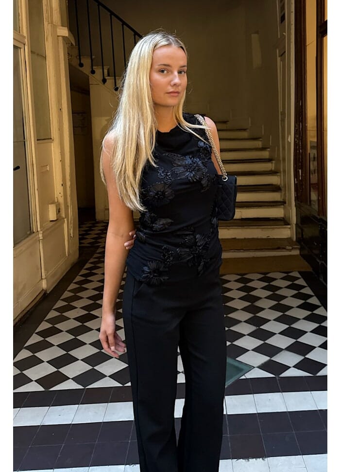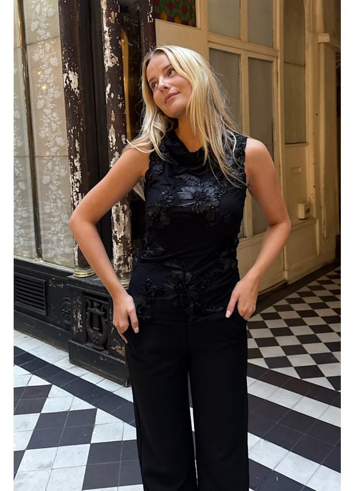 Schwarzes Mesh-Top von BYIC mit 3D-Blumenmuster. Das Top hat kleine Rüschen an den Schultern und Raffdetails an den Seiten, die ihm Struktur und Form verleihen.