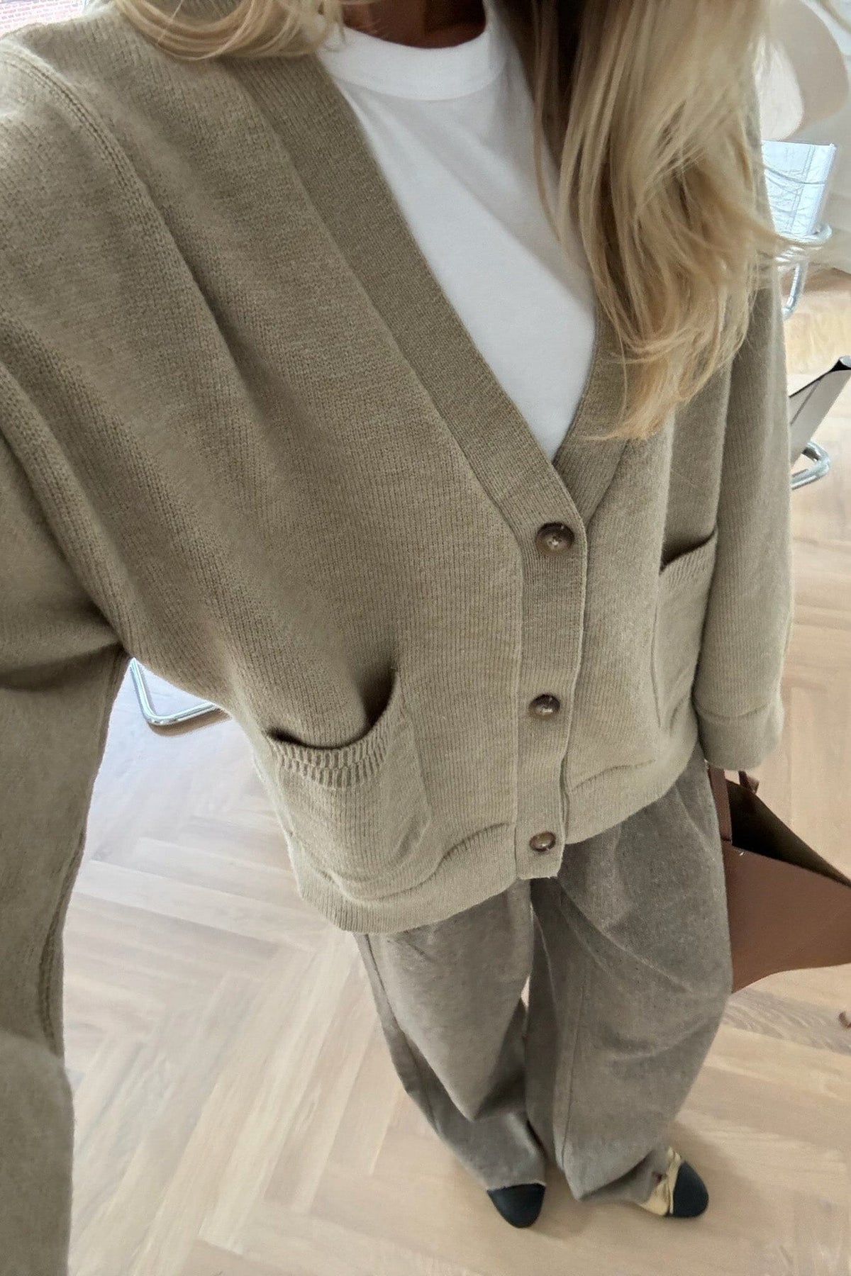 Beige Cardigan von BYIC aus Strick mit breiten Ärmeln und V-Ausschnitt. Die Cardigan hat sichtbare Knöpfe und zwei Taschen vorne. Der schlichte Stil macht es einfach, sie mit anderer Kleidung zu kombinieren.