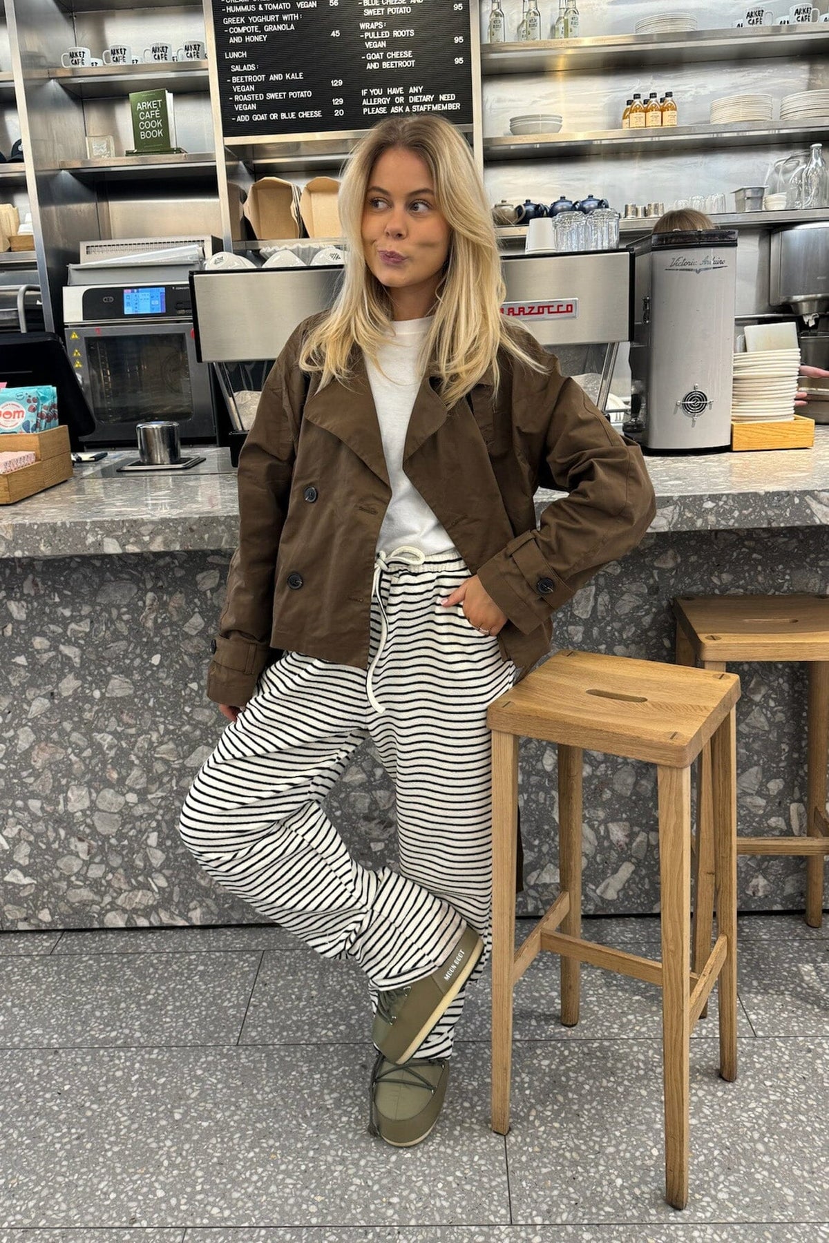 Weiß-schwarz gestreifte weiche Hosen mit Taschen auf jeder Seite, haben ein dünnes Gummiband und eine normale Schnur um die Taille. Entspricht der angegebenen Größe.