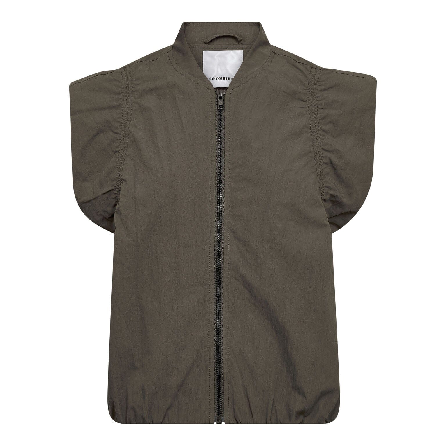 Ärmlose Weste von Co´Couture in einem tiefen Armeegrün. Die Weste hat ein ärmelloses Design mit Puffschultern und einem hohen Halsausschnitt.