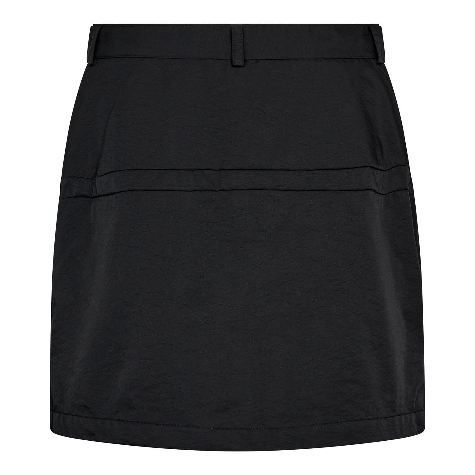 Schwarzer Rock von Co´Couture. Er hat einen Gürtel mit Schnalle und zwei Fronttaschen mit Patten, was ihm einen funktionalen Ausdruck verleiht.
