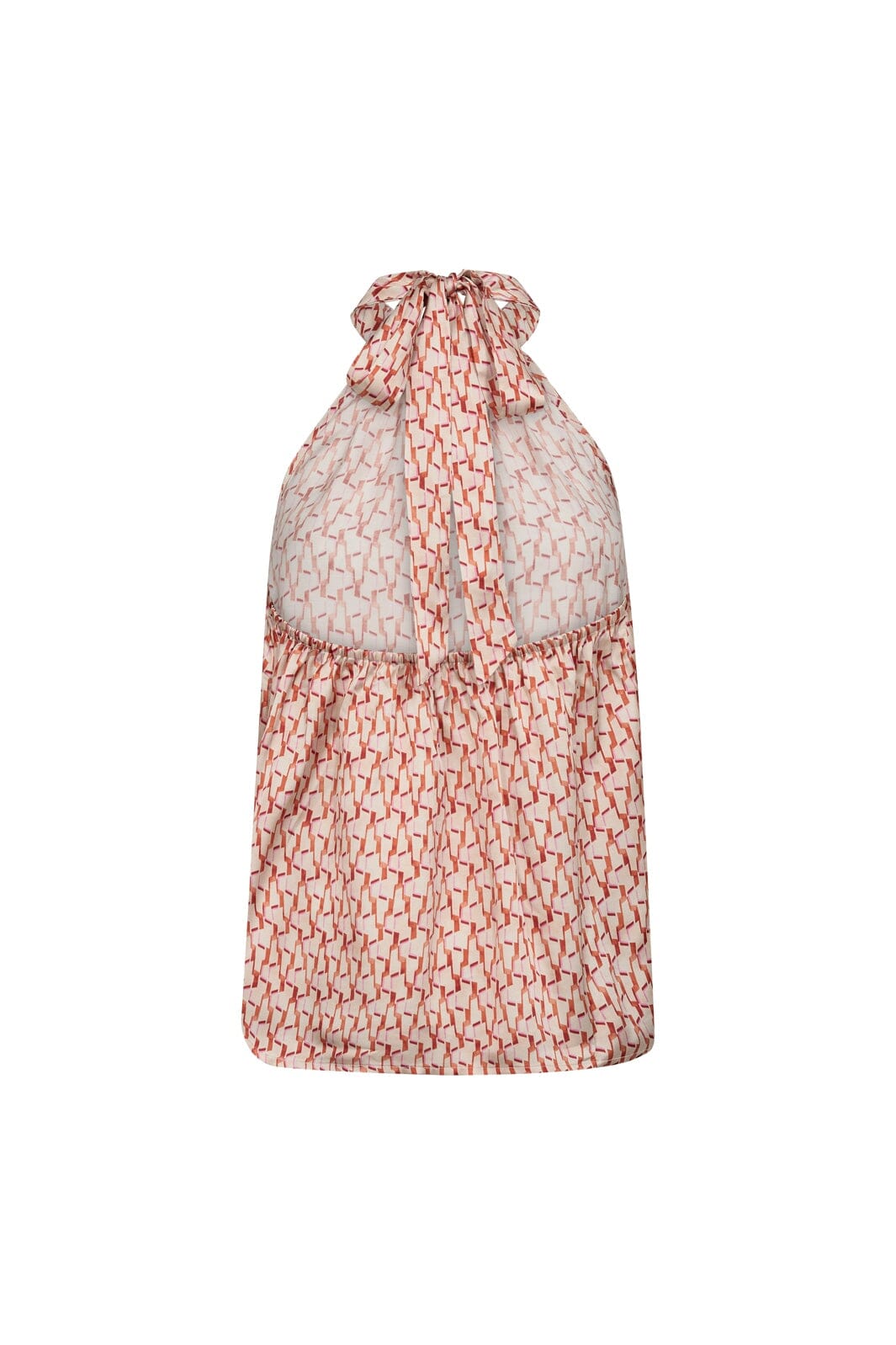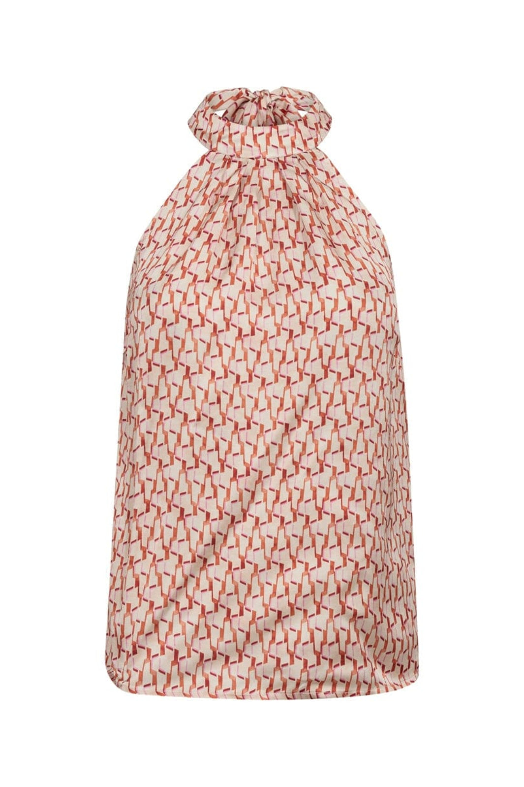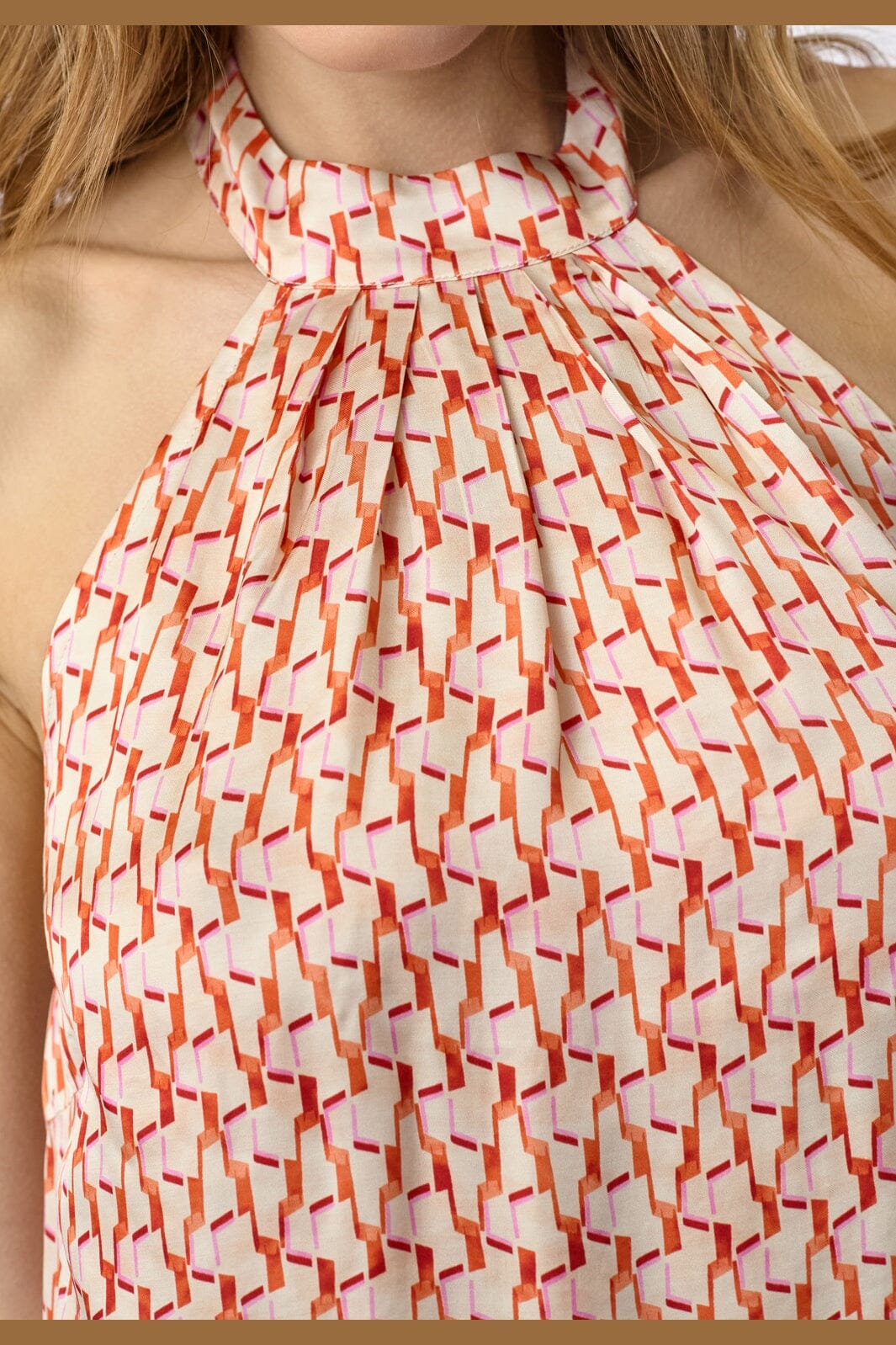Neckholder-Top von Co´Couture aus 100% Viskose mit einem geometrischen Muster in roten, pinken und orangefarbenen Nuancen auf hellem Hintergrund.