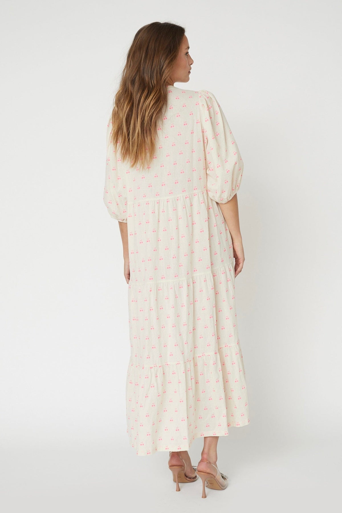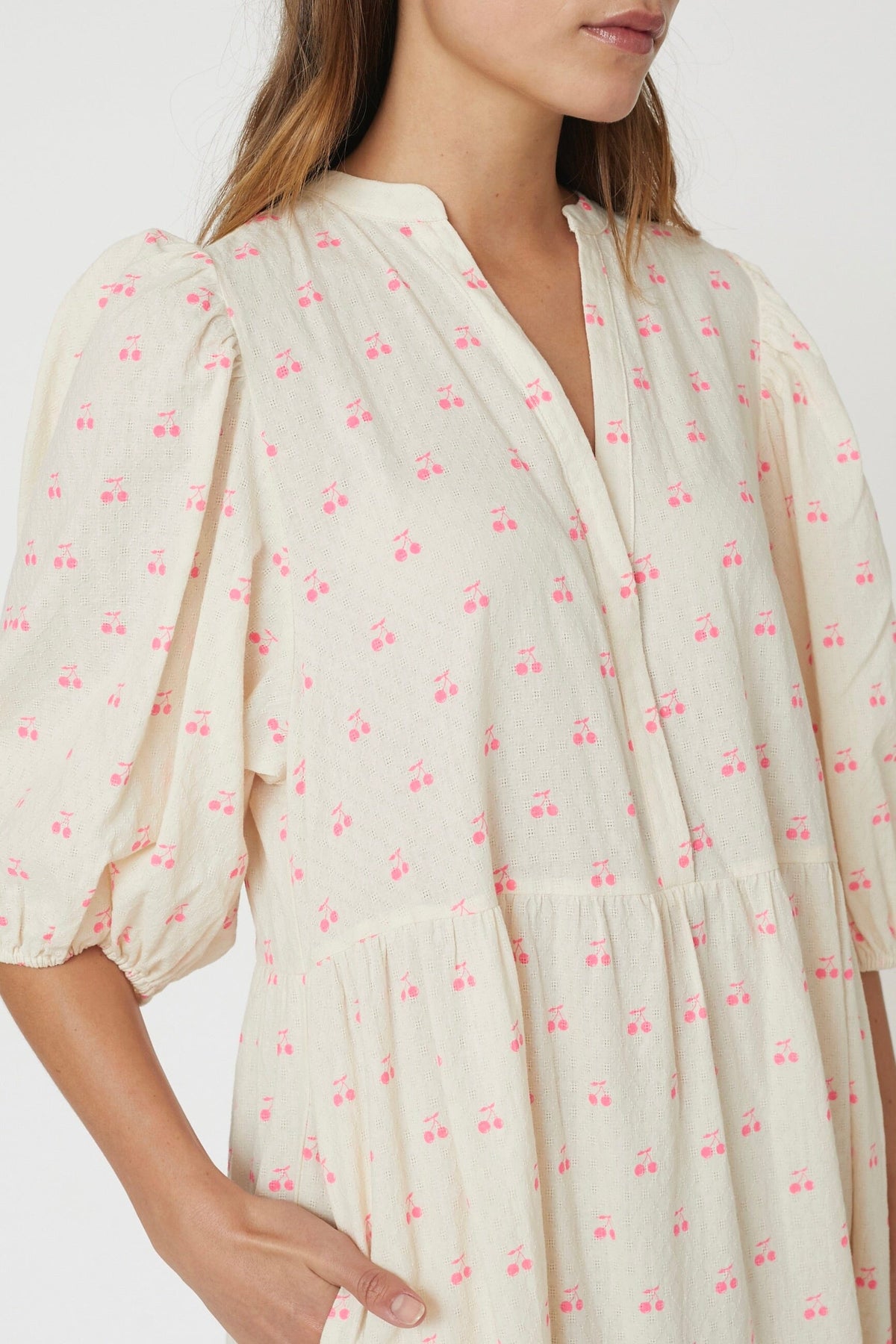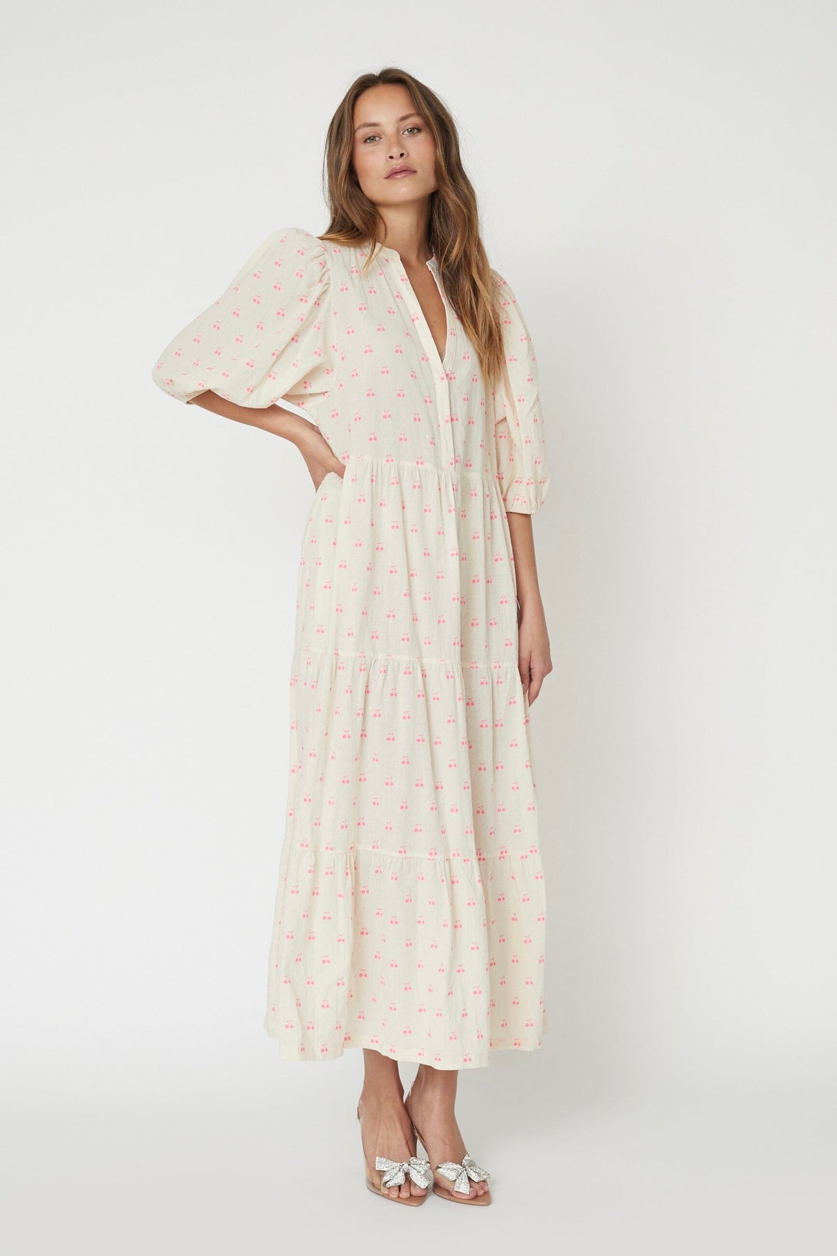 Bodenlange Kleid von Co'Couture mit beigem Grund und neongrünen Kirschmuster. Das Kleid hat einen V-Ausschnitt mit Rüschen und 3/4 Puffärmeln.