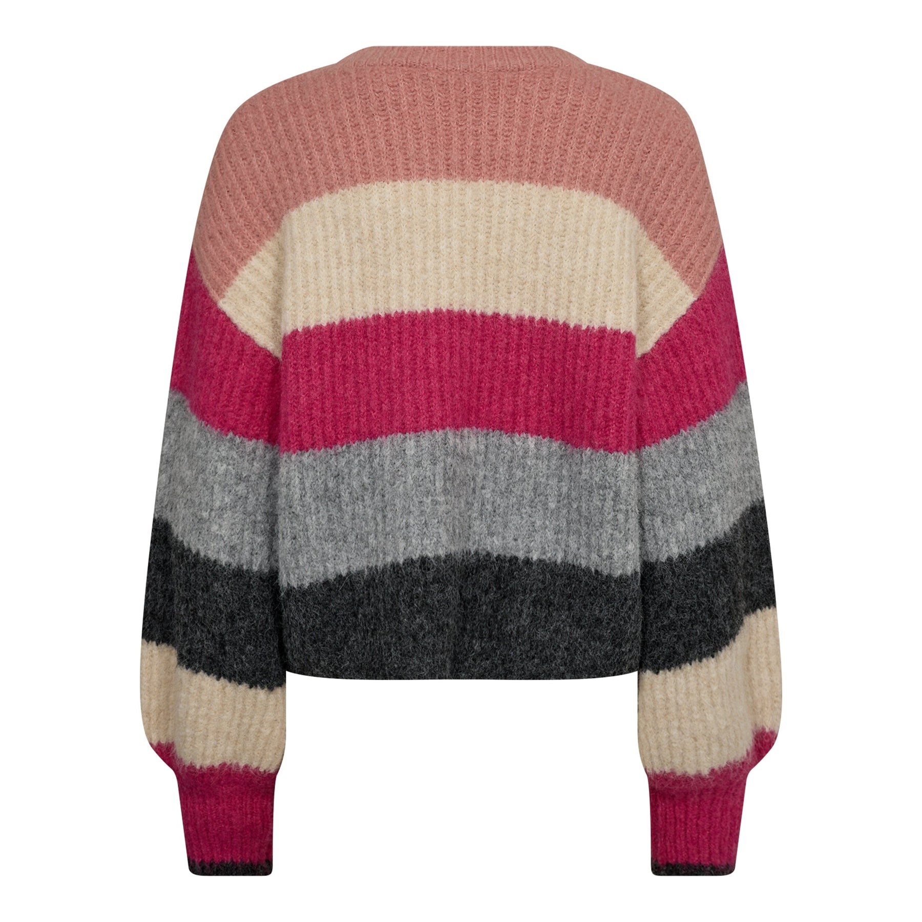 Strickpullover von Co'couture mit Streifen in Pink, Beige, Grau und Schwarz. Die gestrickte Textur und die lockeren Ärmel schaffen einen lässigen Look mit Fokus auf die Farbkombination.