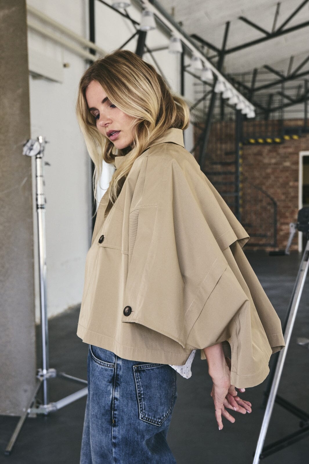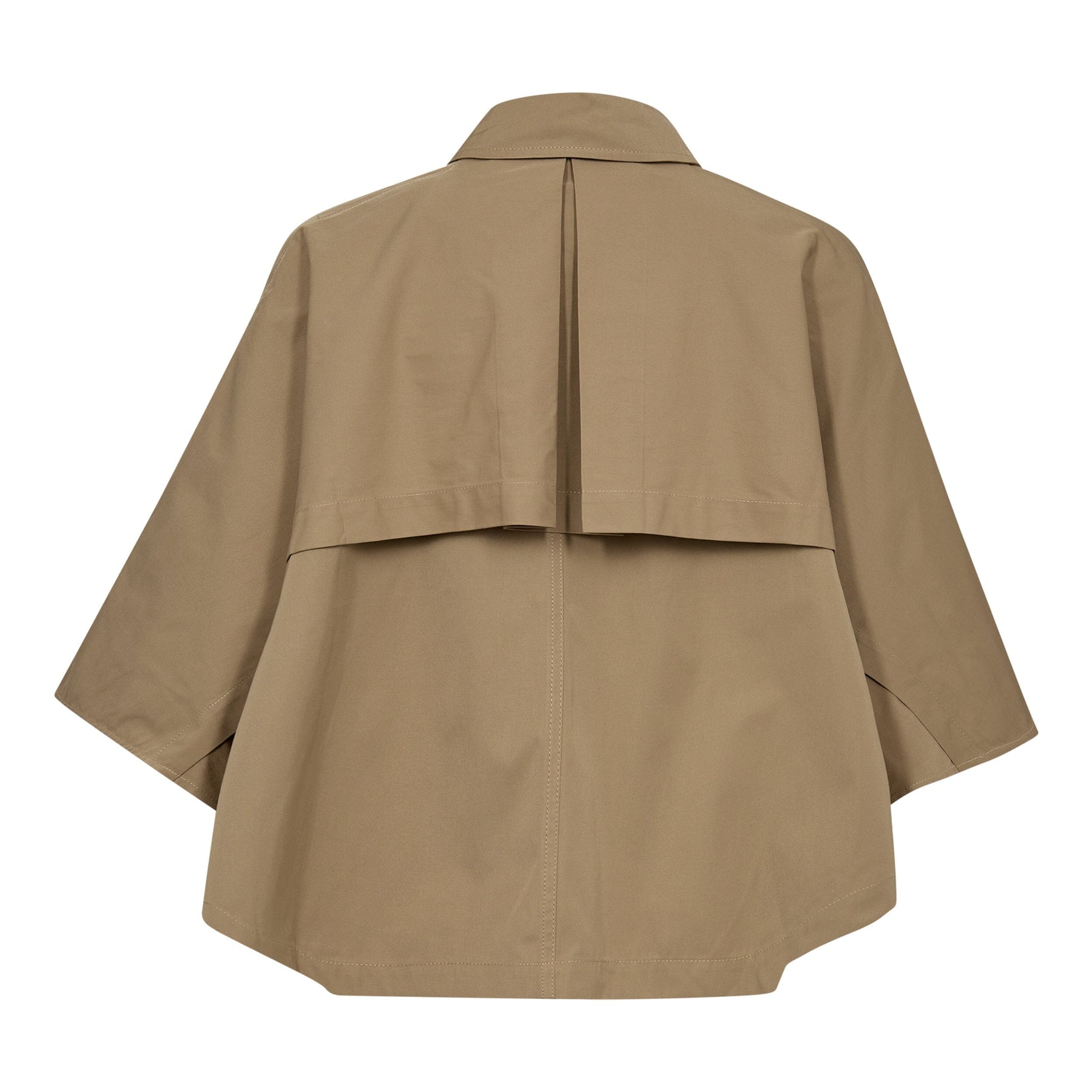 Khaki-Jacke von Co'Couture mit kurzem Cape-Design. Sie hat einen Hemdkragen, Knöpfe vorne und Falten hinten. Die Ärmel sind 3/4-lang mit weiter Passform.
