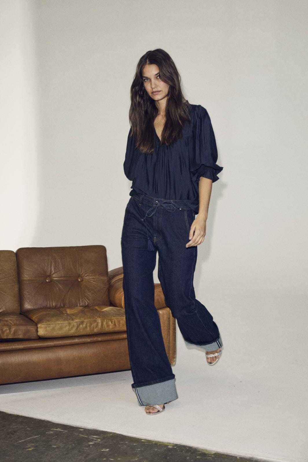 Dunkelblaue Bluse von Co´couture mit Puffärmeln und Spitzenakzenten. Die Bluse hat einen V-Ausschnitt und eine Schnürung mit Quasten, die ihr einen leichten und luftigen Ausdruck verleiht.