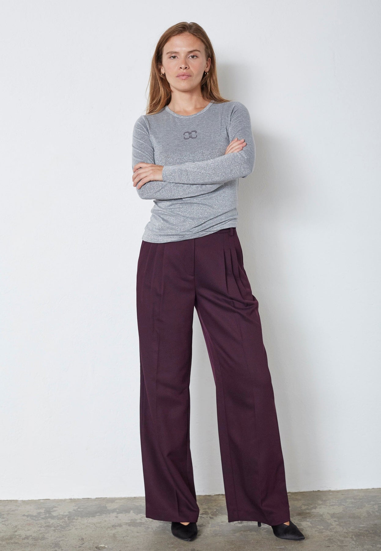 Silberfarbenes Langarmshirt von Co'Couture mit Stickerei auf der Brust. Das Shirt hat einen Rundhalsausschnitt und einen glänzenden Look durch die Metallfäden im Stoff.