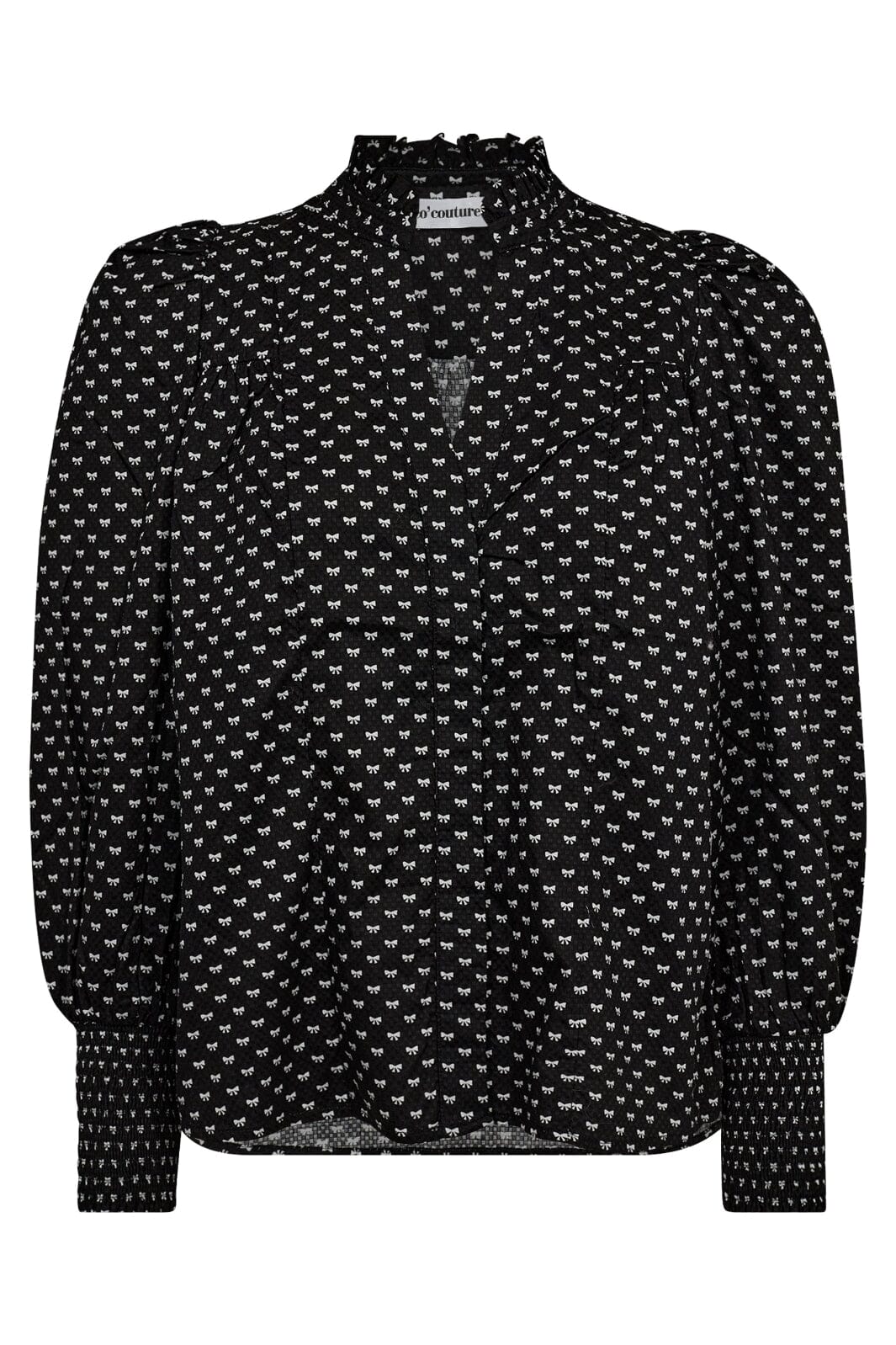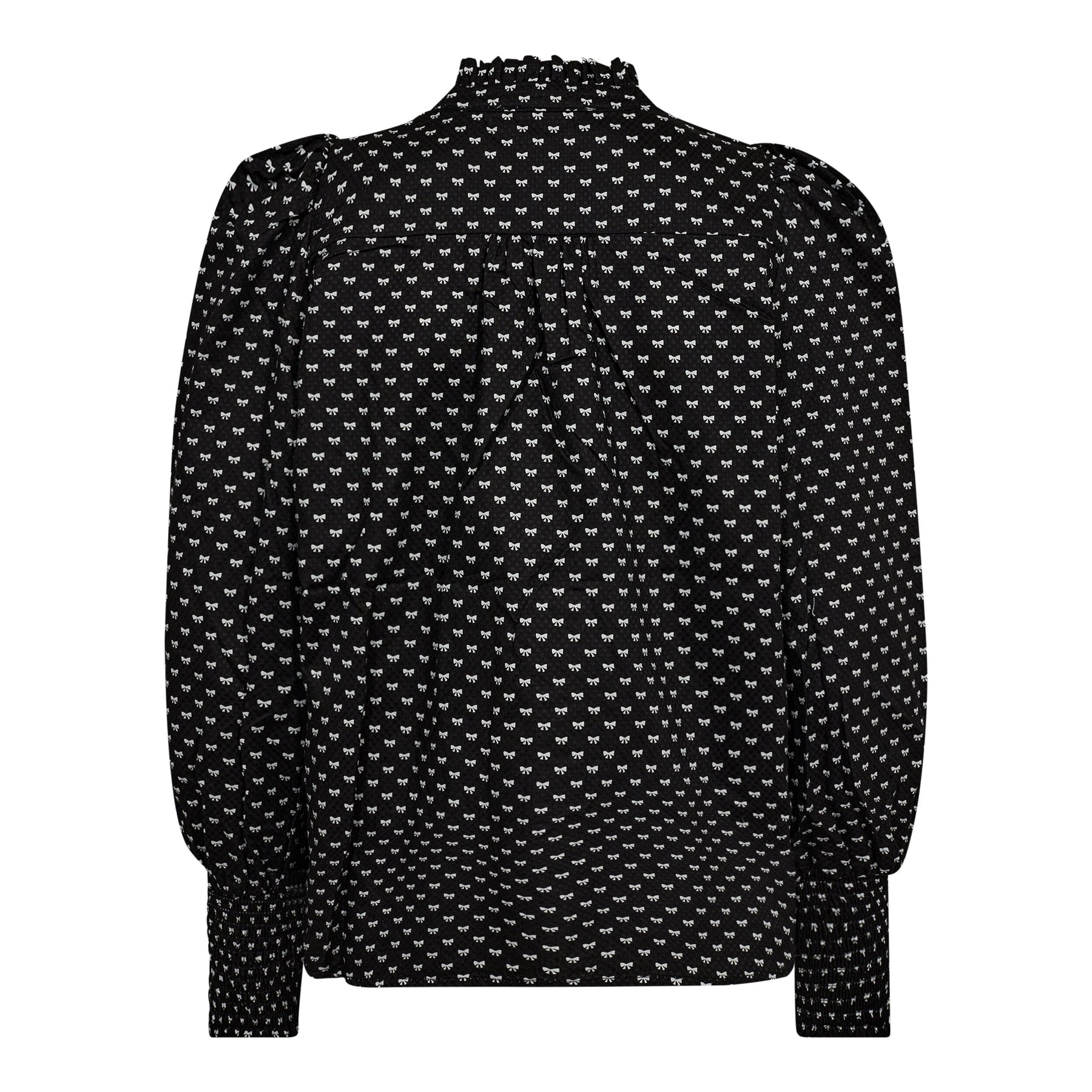 Schwarze Bluse von Co´couture mit V-Ausschnitt und langen Ärmeln. Die Bluse hat Rüschen am Hals und ein durchgehendes Muster aus kleinen weißen Schleifen auf schwarzem Hintergrund.
