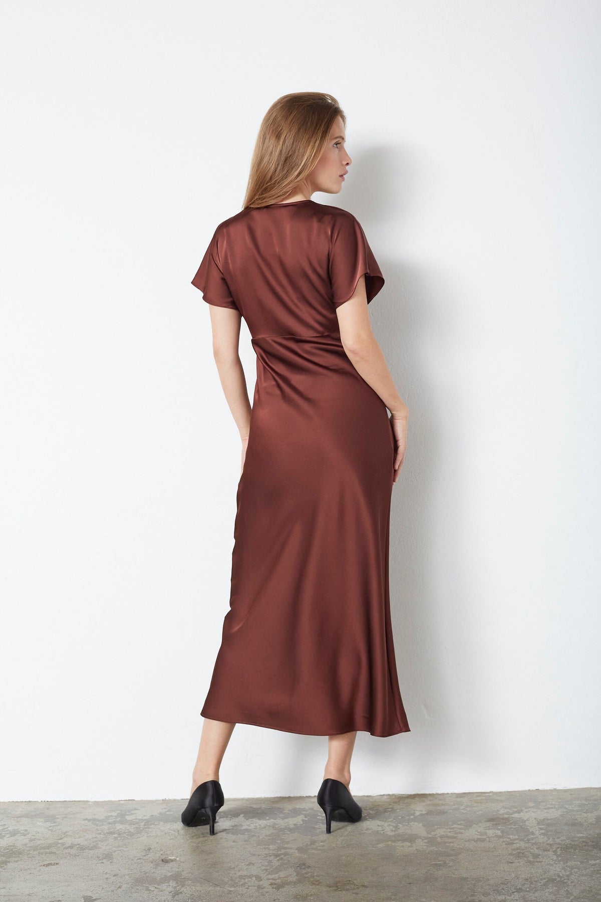 Dunkelbraunes Kleid von Co'Couture mit V-Ausschnitt und kurzen Ärmeln. Das Kleid hat eine knöchellange Silhouette mit Rüschen-Details und eignet sich sowohl für Hochzeiten als auch andere festliche Anlässe.