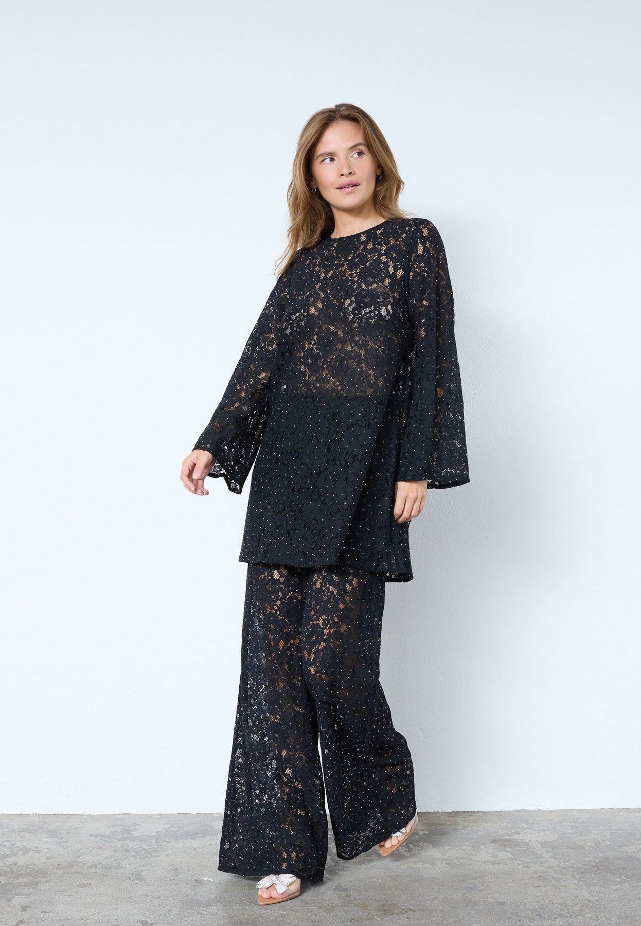 Schwarze Hosen von Co'Couture mit Spitzenmuster und Pailletten. Die Hosen haben einen halbtransparenten Effekt und ein Blumenmuster, das von der Taille bis zum Knöchel verläuft.