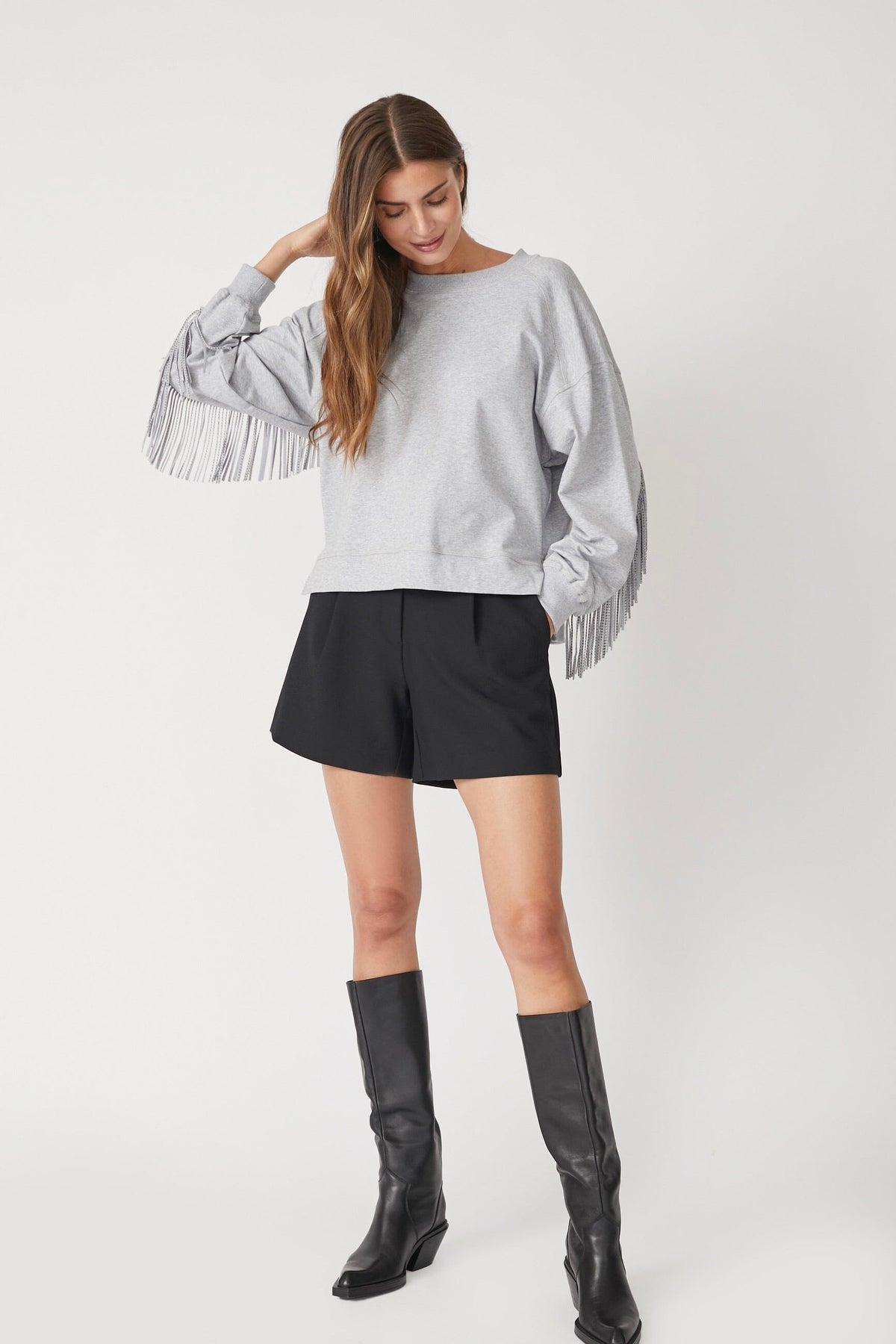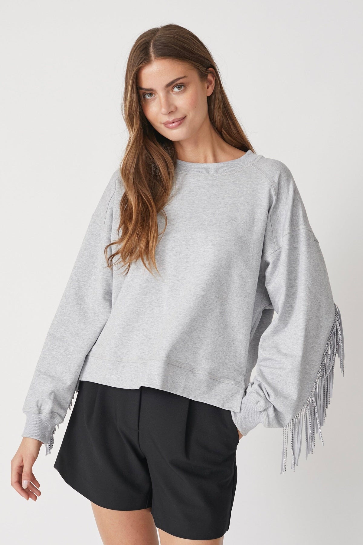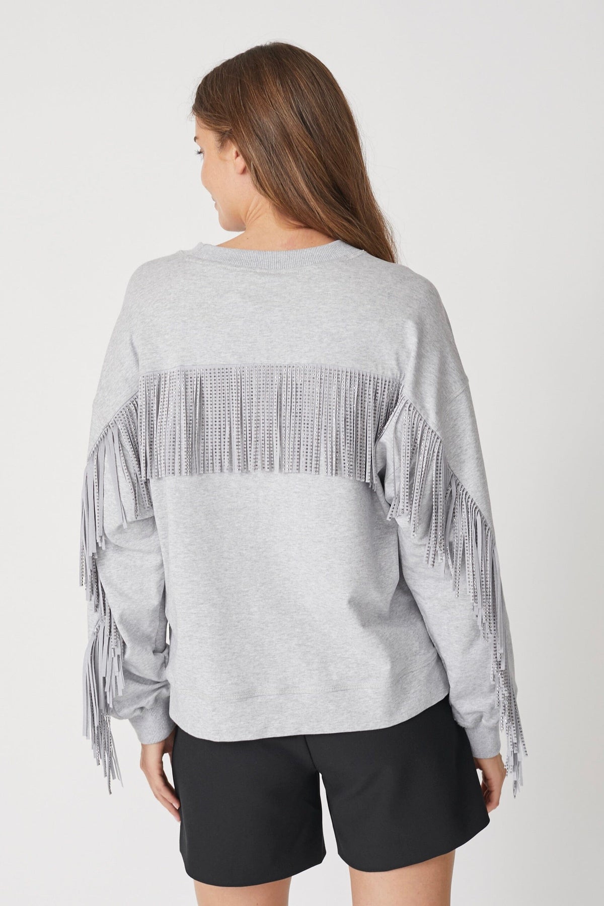 Helle graue Sweatshirt von Co'Couture mit Fransen an den Ärmeln und am Rücken. Der runde Halsausschnitt und die langen Ärmel verleihen einen klaren und einfachen Look.