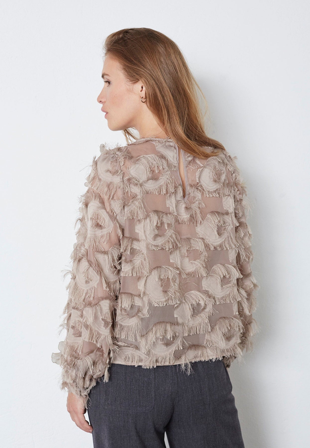 Braune Bluse von Co'Couture in walnussfarbenem Polyester. Die Bluse hat eine strukturierte Oberfläche mit Schichten aus gerafften Details und langen Ärmeln mit rundem Halsausschnitt.