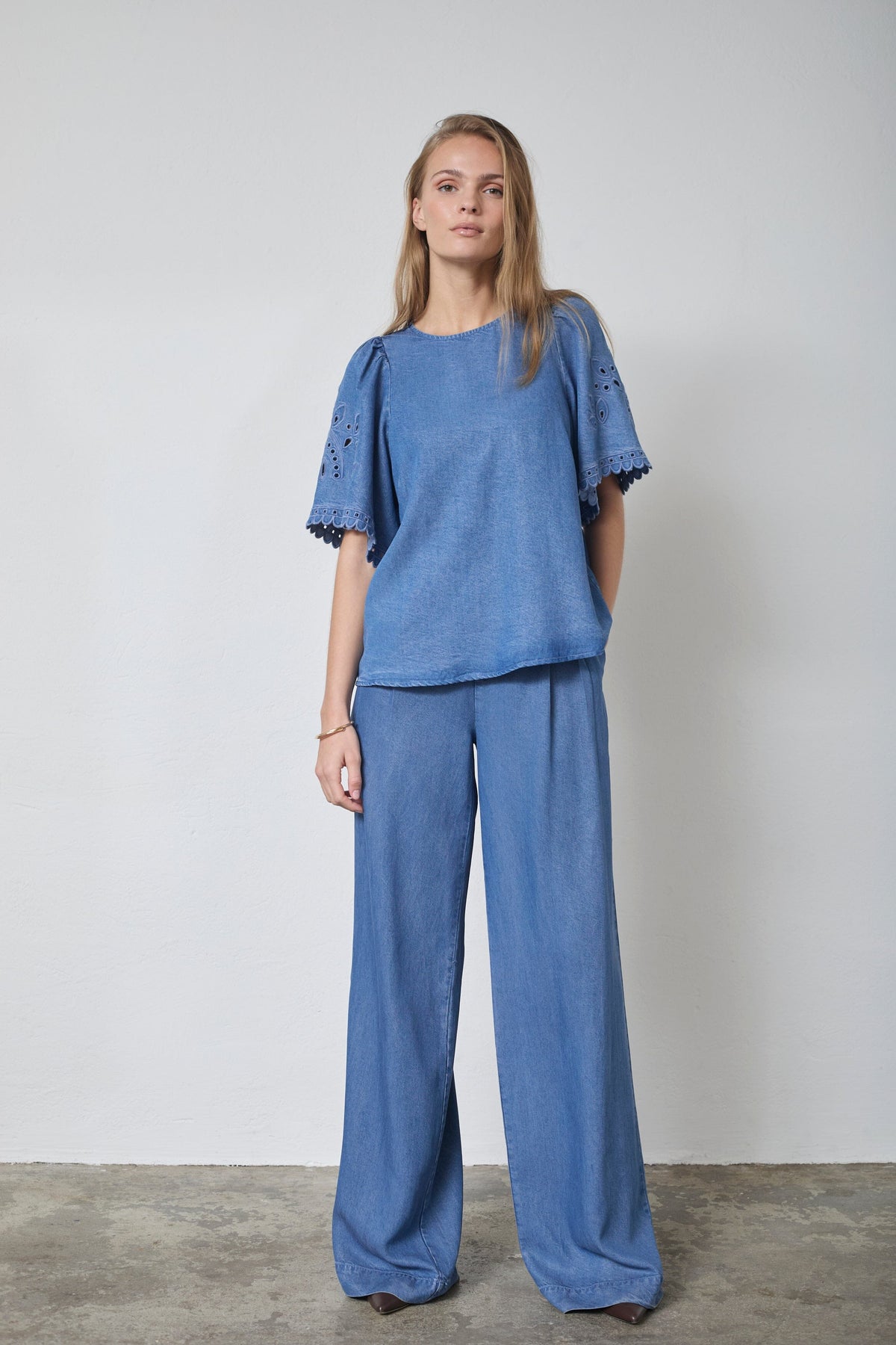 Blaue Bluse von Co´Couture aus 100 % Lyocell. Die Bluse hat gestickte Details an den Ärmeln und einen welligen Saum.