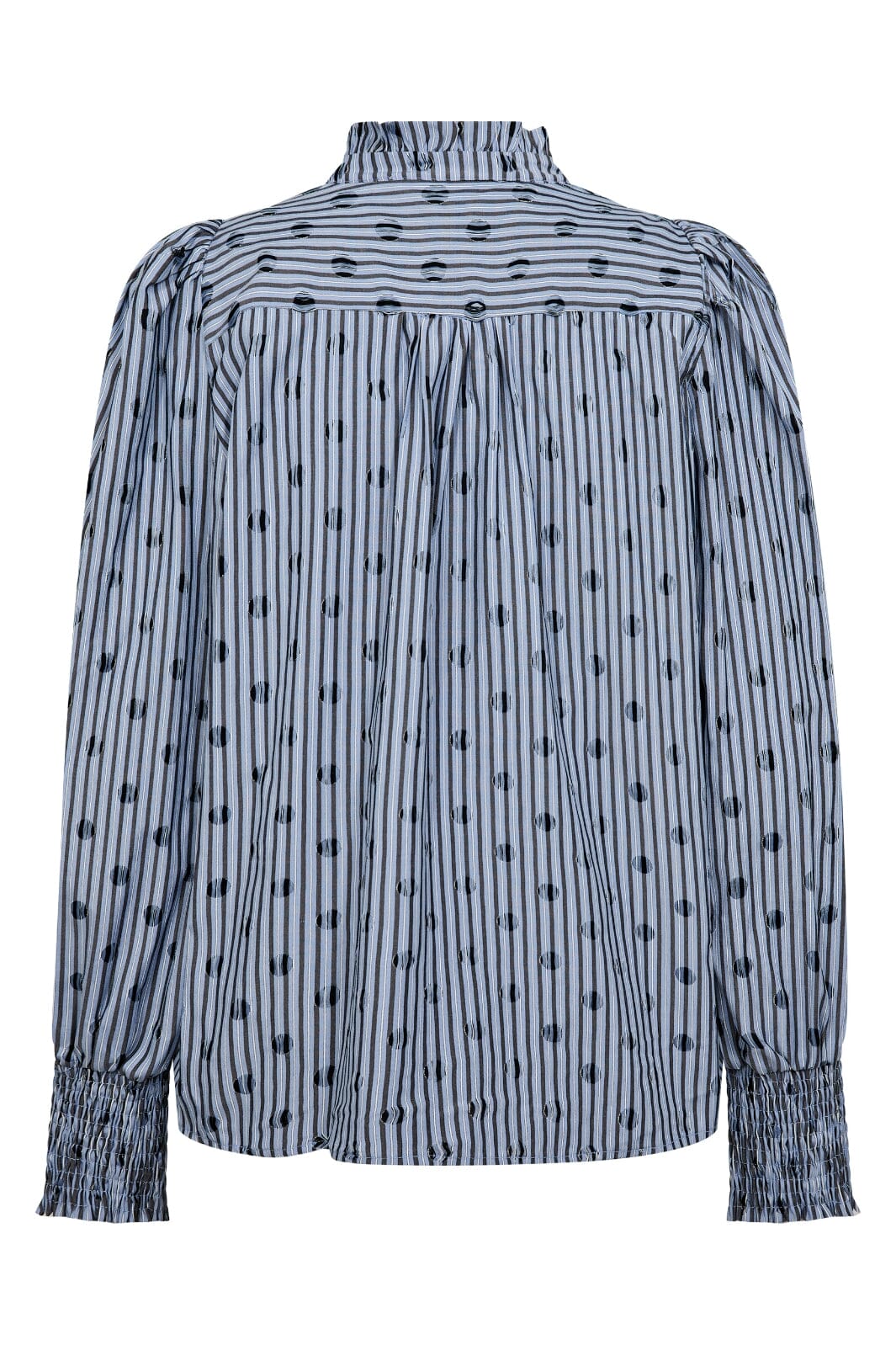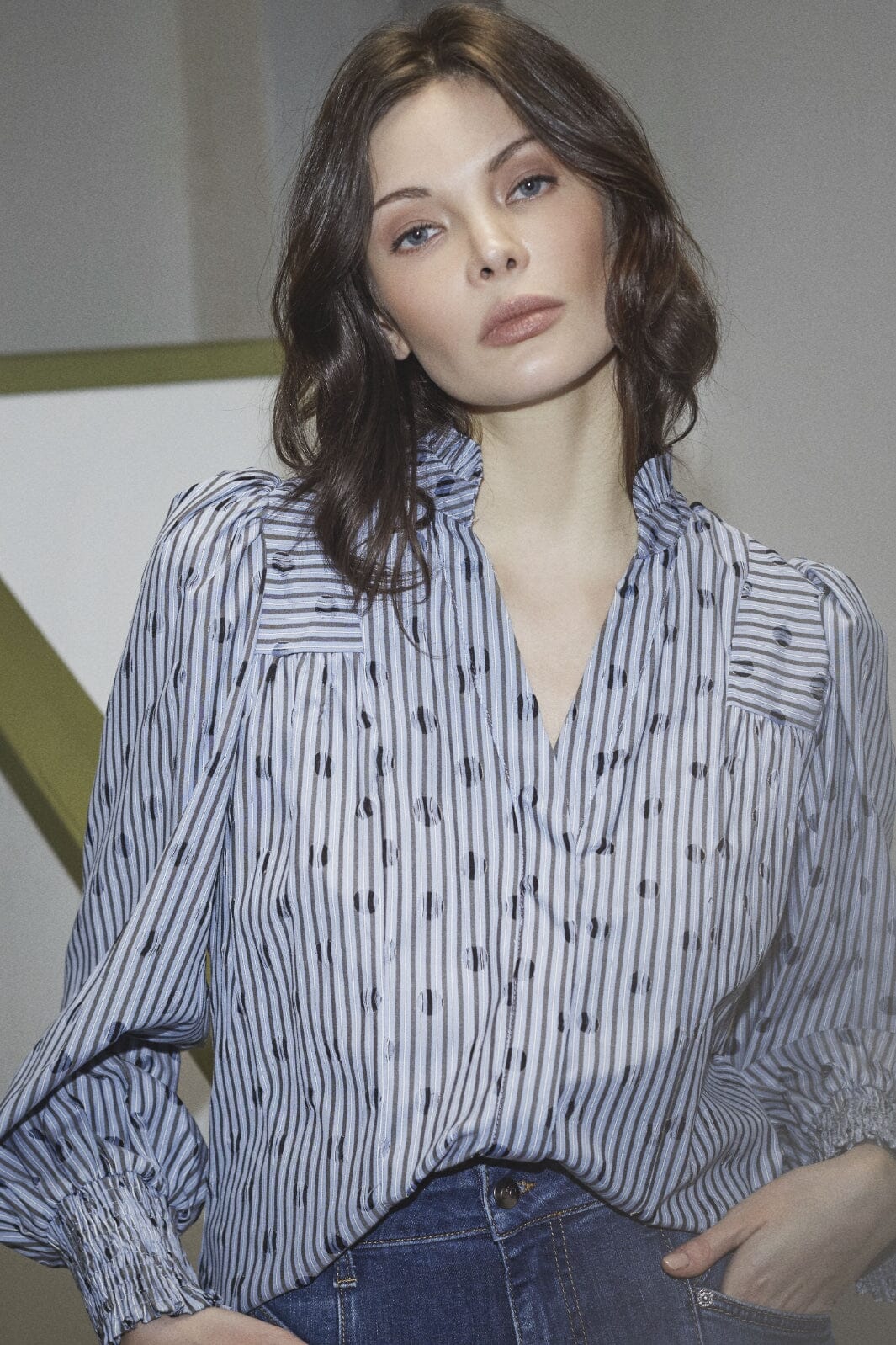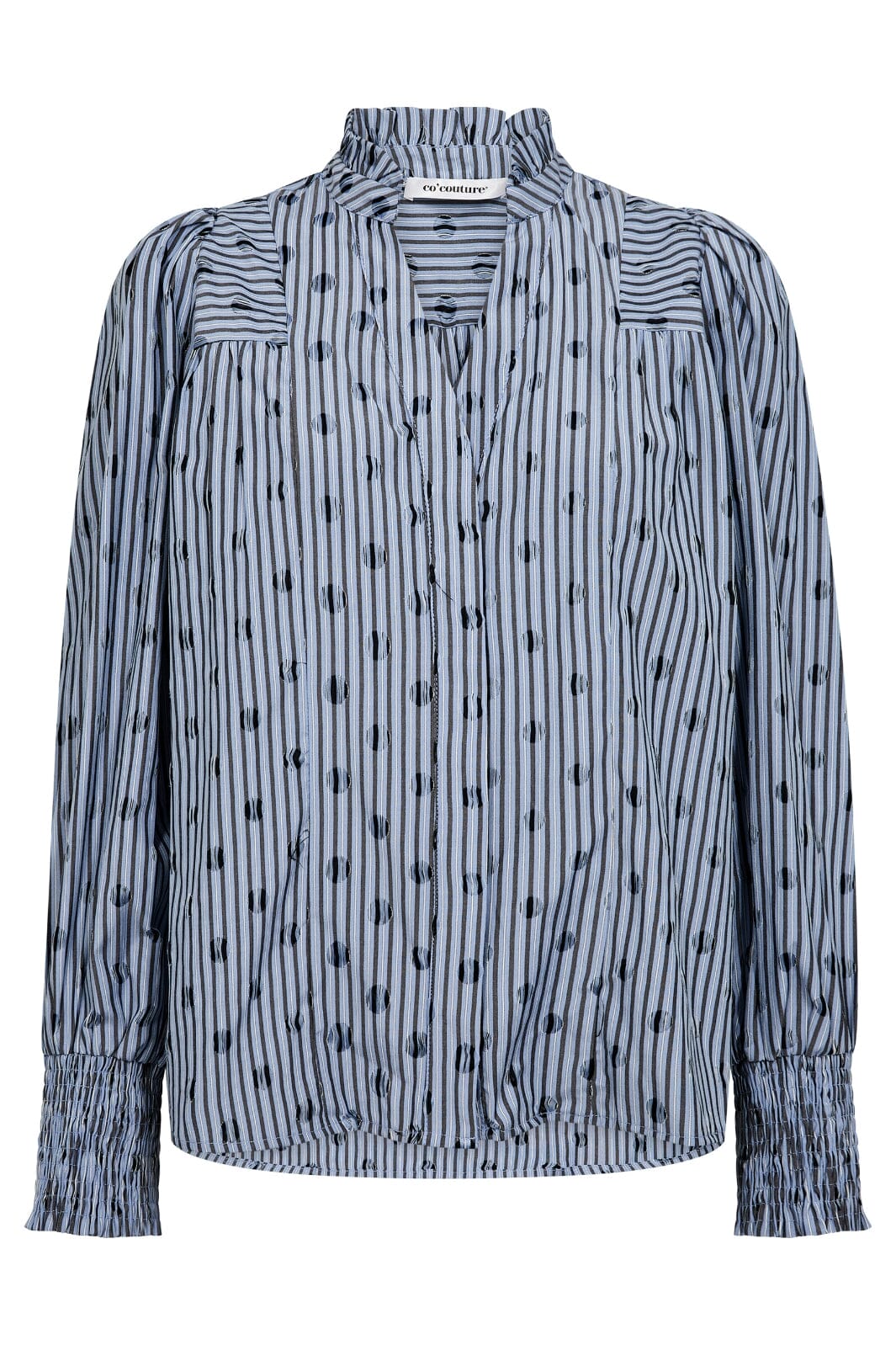 Blaue Bluse von Co´Couture mit Streifen und Punkten. Die Bluse hat einen gerafften Kragen mit Rüschen und lange Ärmel mit Rüschendetails.