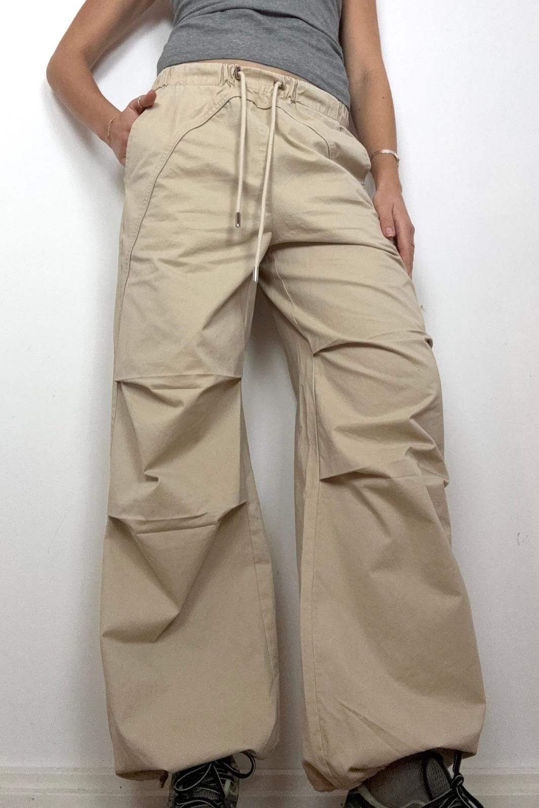 Beige Hose von Continue in einem sandfarbenen Ton. Die Hose hat eine lockere Passform mit dekorativen Nähten und Kordelzugdetails in der Taille.