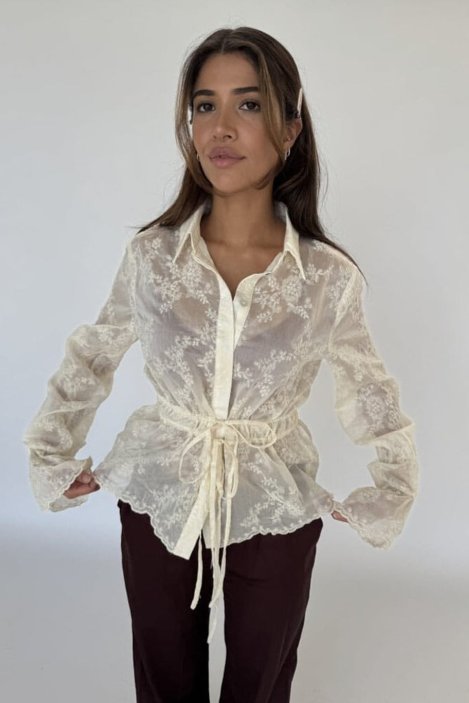 Off-white Hemd von Continue mit gesticktem Blumenmuster. Das Hemd hat einen Hemdkragen, lange Ärmel mit Rüschen und eine Schnürung in der Taille, die es ermöglicht, die Passform anzupassen.