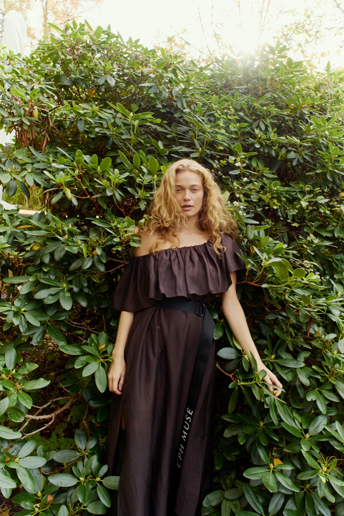 Dunkelbraunes Off-Shoulder-Kleid von Copenhagen Muse aus 85% Lyocell und 15% Polyester. Das Kleid hat oben eine breite Rüsche und einen schwarzen Gürtel mit Logoprint.