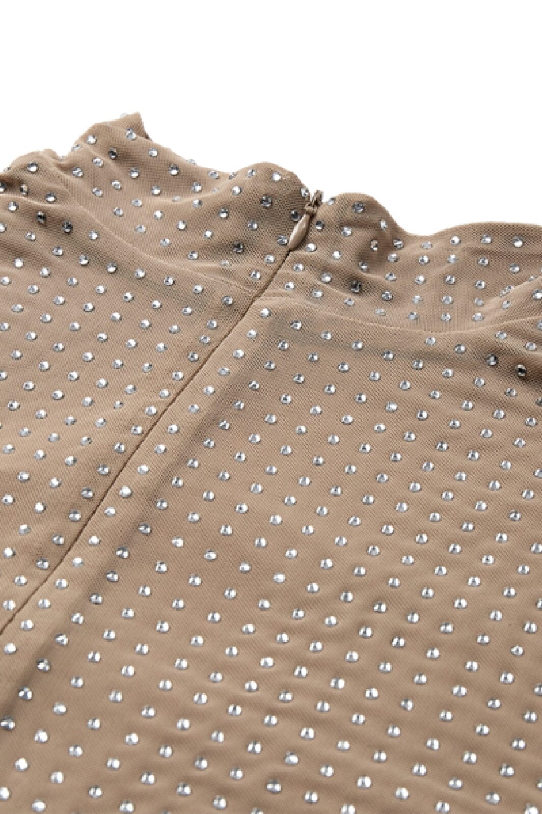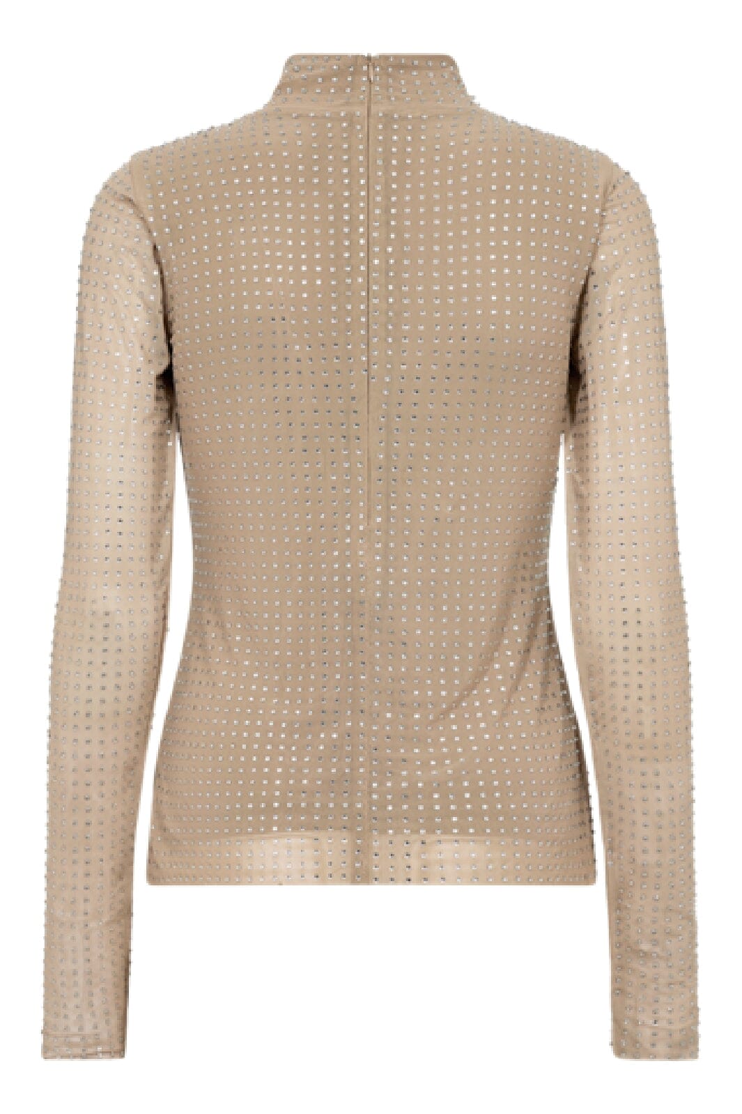 Langärmliges Oberteil von Copenhagen Muse in warmem Sandton. Das Oberteil hat einen hohen Kragen und ist mit kleinen, glänzenden quadratischen Dekorationen bedeckt. Ein Reißverschluss auf der Rückseite erleichtert das An- und Ausziehen.