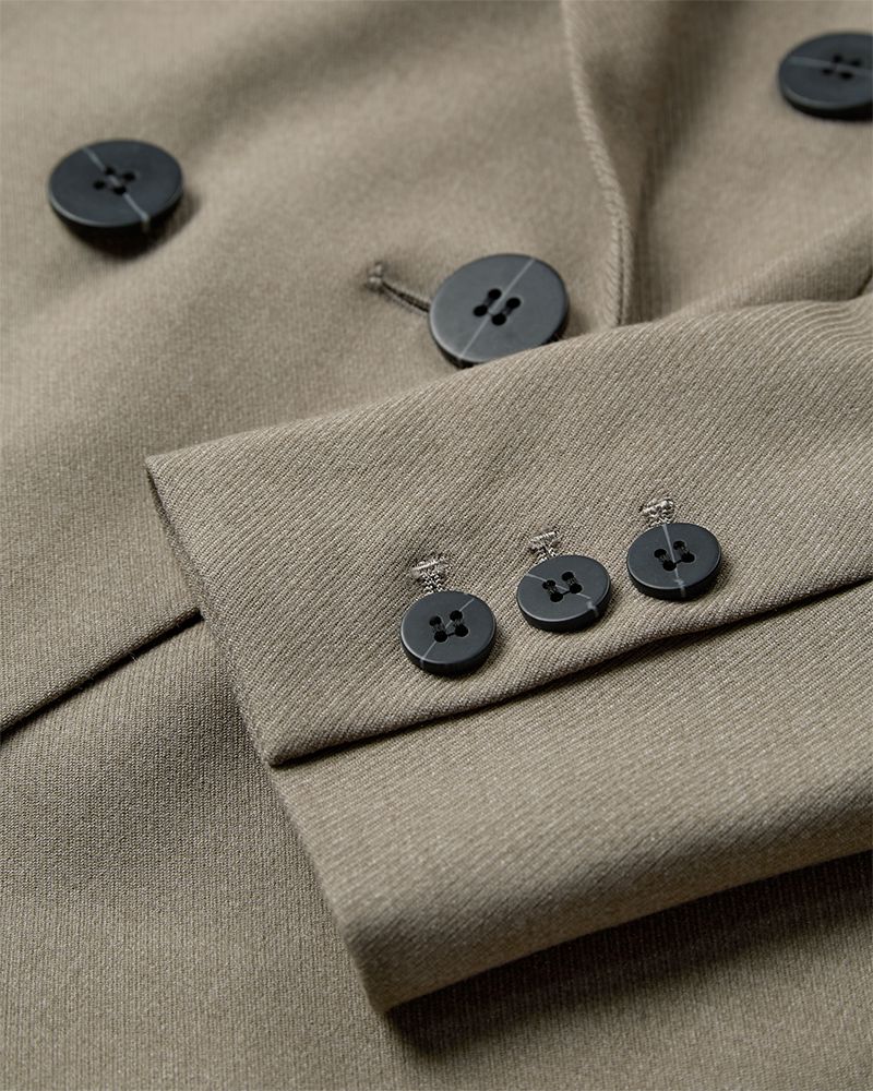 Blazer von Copenhagen Muse in einer beige-grünen Melangefarbe. Der Blazer hat einen klassischen Smoking-Look mit V-Ausschnitt und Revers sowie dekorativen Nähten.