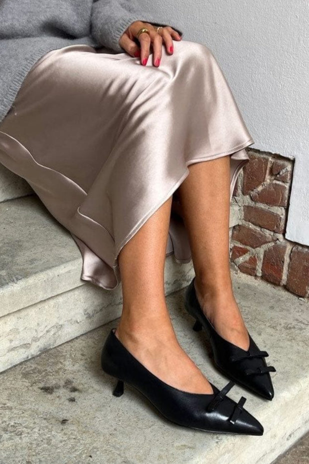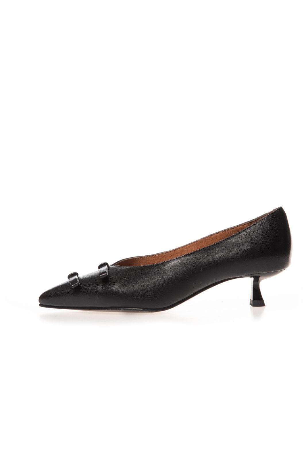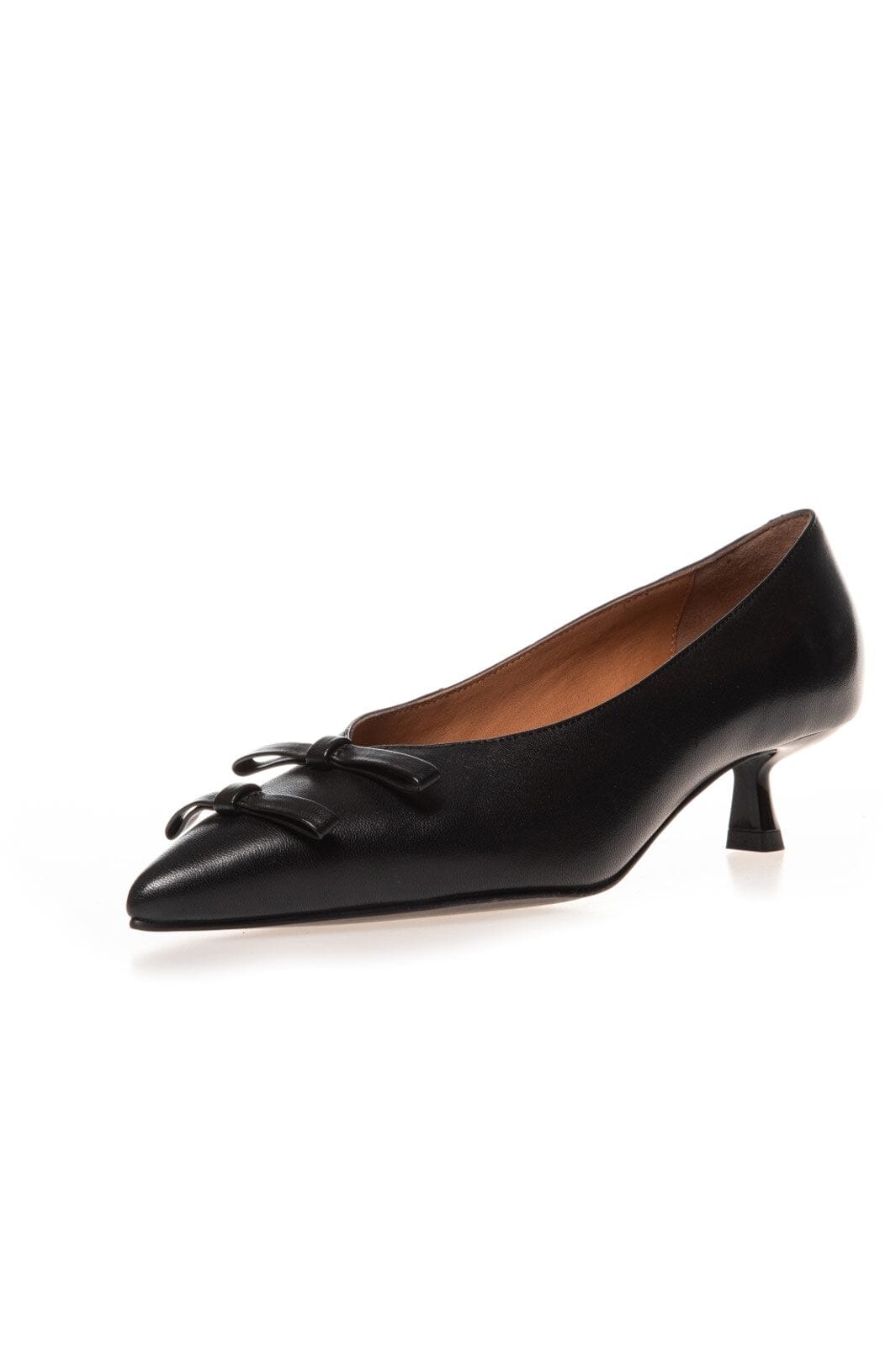 Eine elegante Pumps mit femininem Ausdruck – aus weichem schwarzem Leder gefertigt und mit einem raffinierten doppelten Schleifendetail vorne gestaltet. Die spitze Zehenpartie und der niedrige Absatz verleihen einen anspruchsvollen Look, der sowohl für den Alltag als auch für festliche Anlässe perfekt geeignet ist.