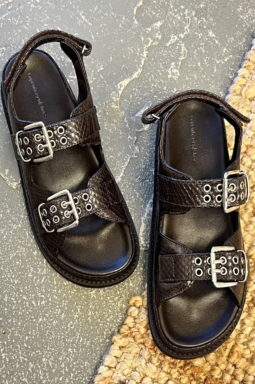 Dunkelbraune Sandale von Copenhagen Shoes aus Leder. Die Sandale hat zwei Metallschnallen und einen Klettverschluss, eine dicke Sohle und einen Fersenriemen.