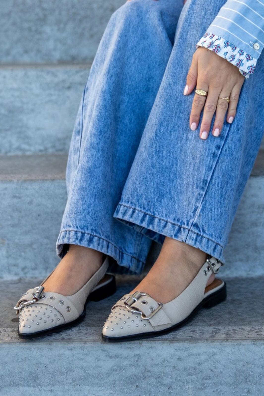 Beige Schuhe aus Leder mit spitzer Zehe und Nieten von Copenhagen Shoes. Die Schuhe haben einen silberfarbenen Schnallenverschluss und einen niedrigen Absatz, der sie praktisch für den Alltag macht.