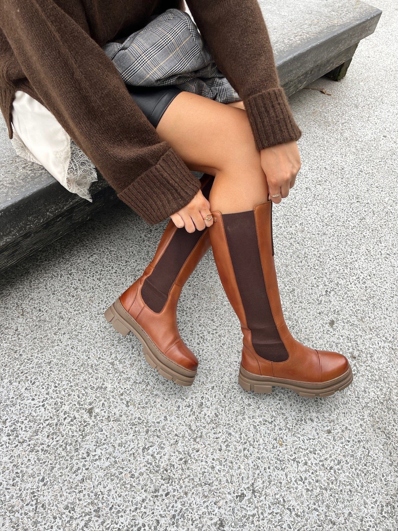Knöchelhohe Stiefel aus cognacfarbenem Leder mit dunklen elastischen Paneelen an den Seiten. Die TPR-Sohle hat ein chunky Design, das guten Halt für den Fuß bietet.