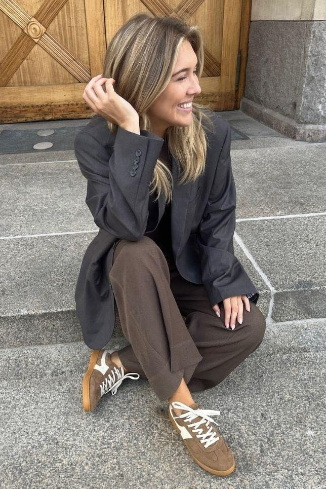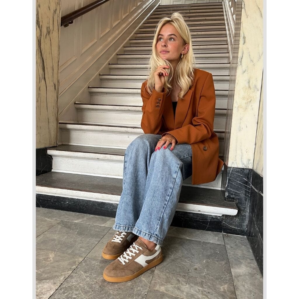 Sneaker von Copenhagen Shoes aus Wildleder in einer neutralen Taupe-Farbe. Die Schuhe haben weiße Details und eine Gummisohle, die einen lässigen und praktischen Look verleiht.