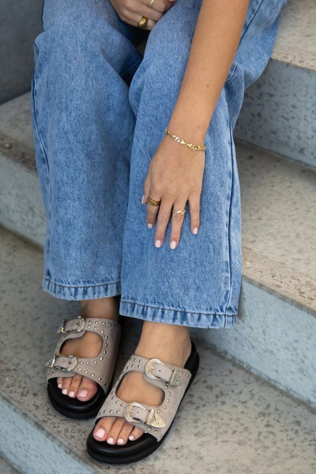 Sandalette aus Wildleder von Copenhagen Shoes. Die hellbeige Sandale hat dekorative Schnallen und Nieten auf der Oberseite sowie eine schwarze Sohle.