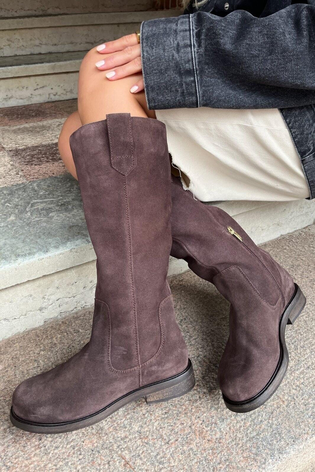 Knöchelhohe Stiefel aus braunem Wildleder mit runder Zehe. Der Stiefel hat einen niedrigen Blockabsatz und einen Reißverschluss an der Seite. Der braune Farbton verleiht dem Stiefel einen rustikalen Ausdruck.