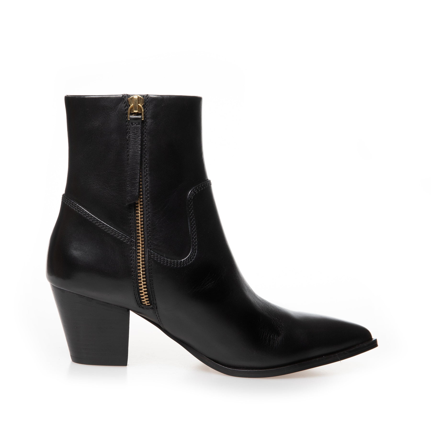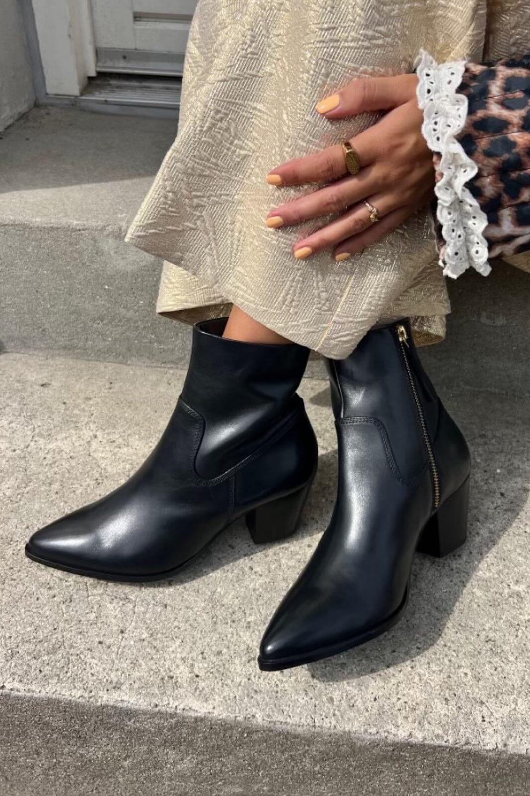 Schwarze Ankle Boots von Copenhagen Shoes aus Leder mit spitzer Zehe. Der Stiefel hat einen Blockabsatz und einen Reißverschluss an der Seite.