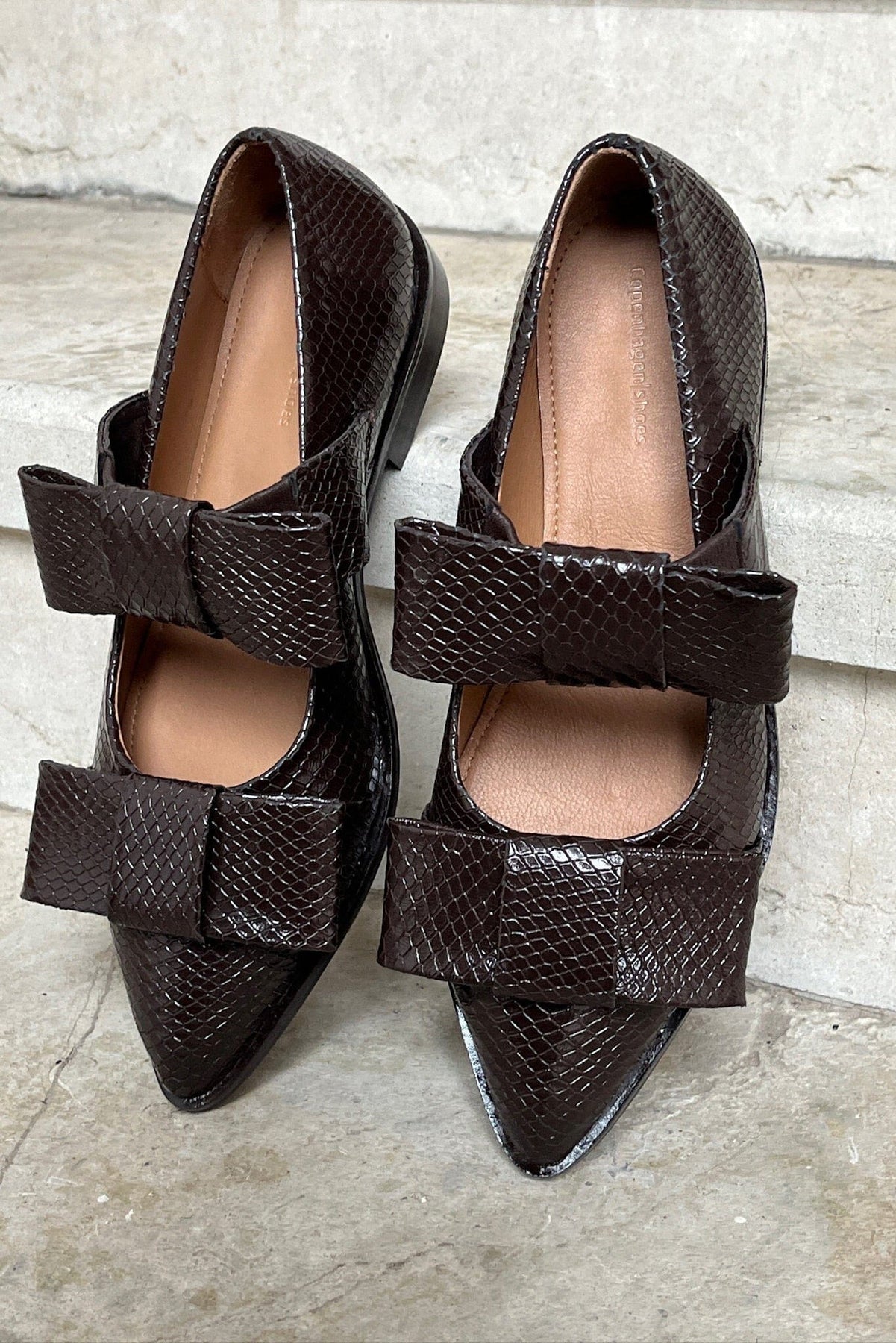 Ballerinas von Copenhagen Shoes aus dunkelbraunem Leder mit einem glänzenden, schuppenähnlichen Muster und zwei großen Schleifen oben.