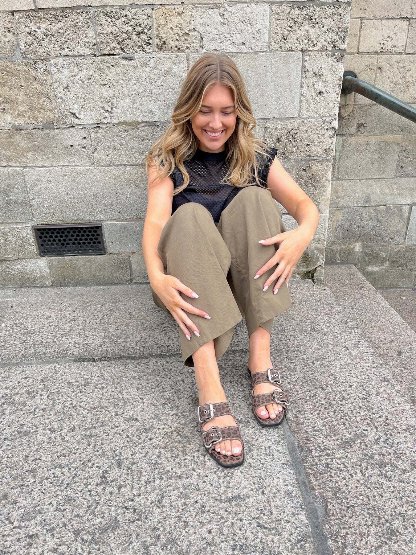 Sandal von Copenhagen Shoes mit braunem und schwarzem Leopardenmuster. Die flache Sandale hat zwei Schnallen und eine offene Zehe, die es einfach macht, sie an den Fuß anzupassen.