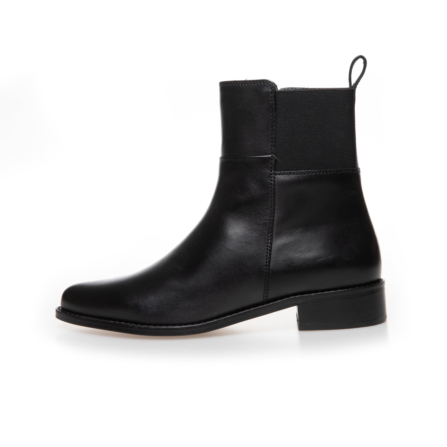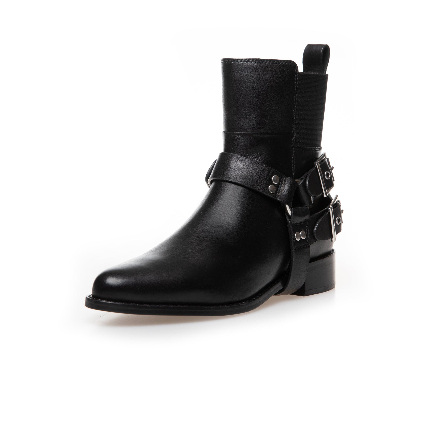Schwarze Ankle Boots aus Leder mit zwei Schnallen an der Seite. Der Stiefel hat eine spitze Zehe und einen niedrigen Blockabsatz, der guten Halt beim Gehen bietet.