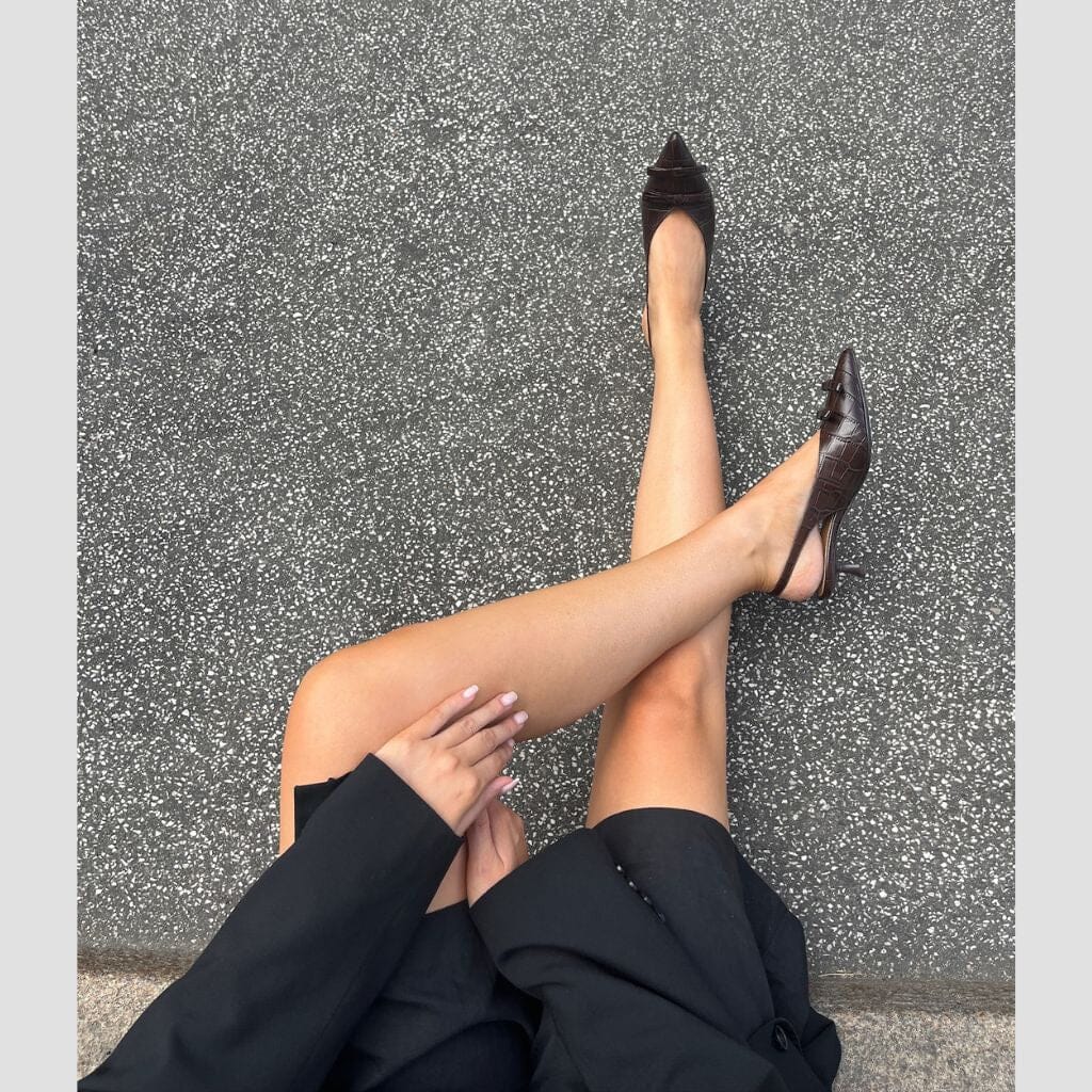 Slingback-Schuhe von Copenhagen Shoes aus dunkelbraunem Leder mit Krokodilprägung. Die Schuhe haben eine spitze Zehenpartie und einen Stilettoabsatz und eignen sich für festliche und formelle Anlässe.