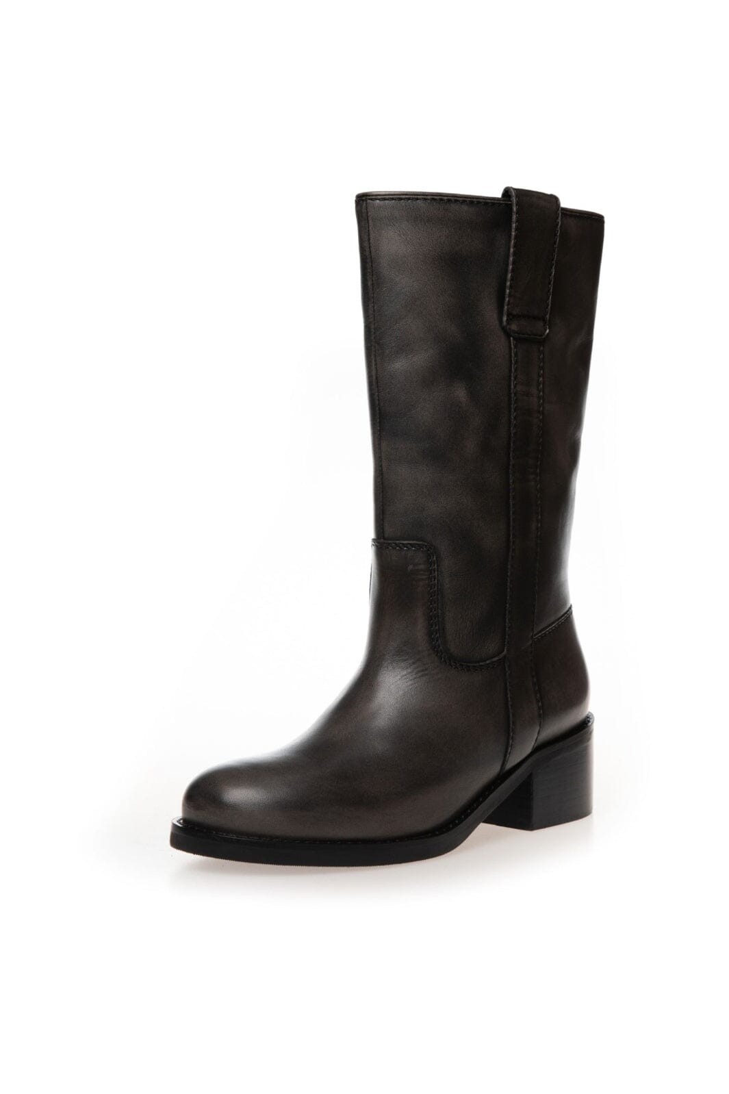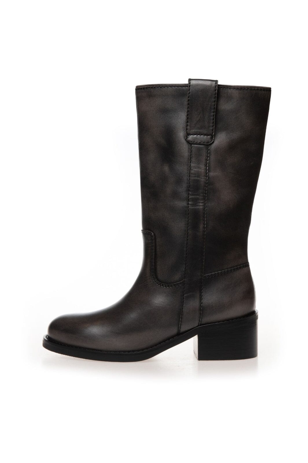 Beige und schwarze Stiefel von Copenhagen Shoes aus Leder mit mittelhohem Blockabsatz. Die Stiefel haben eine runde Spitze und ein praktisches Slip-On-Design ohne Verschluss.