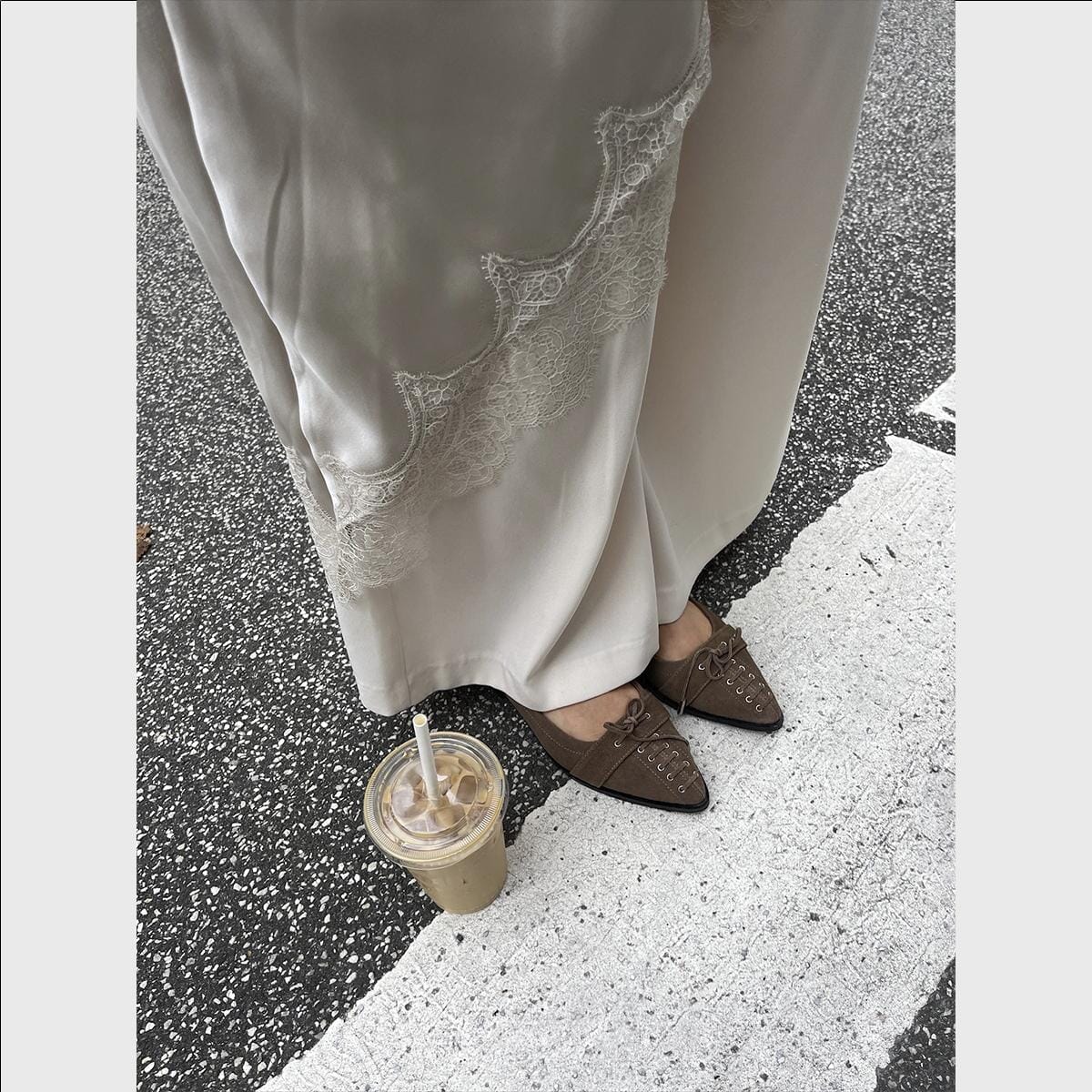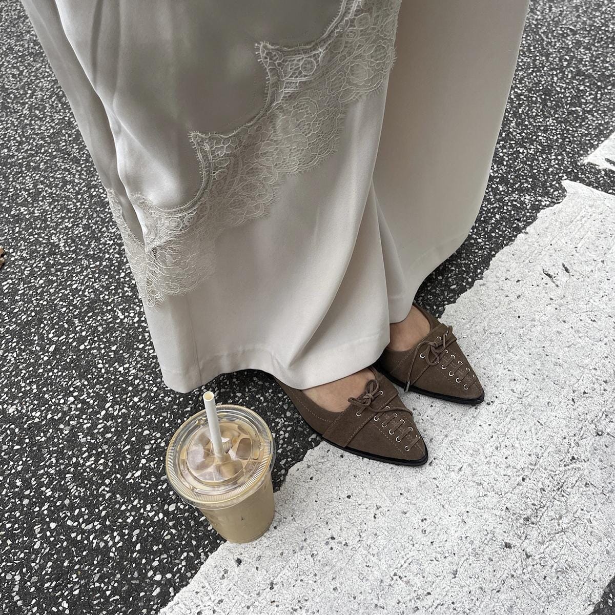 Spitze Schuhe von Copenhagen Shoes in einem hellbraunen Lederfarbton. Die Schuhe haben Schnürdetails auf der Vorderseite und einen niedrigen Absatz.
