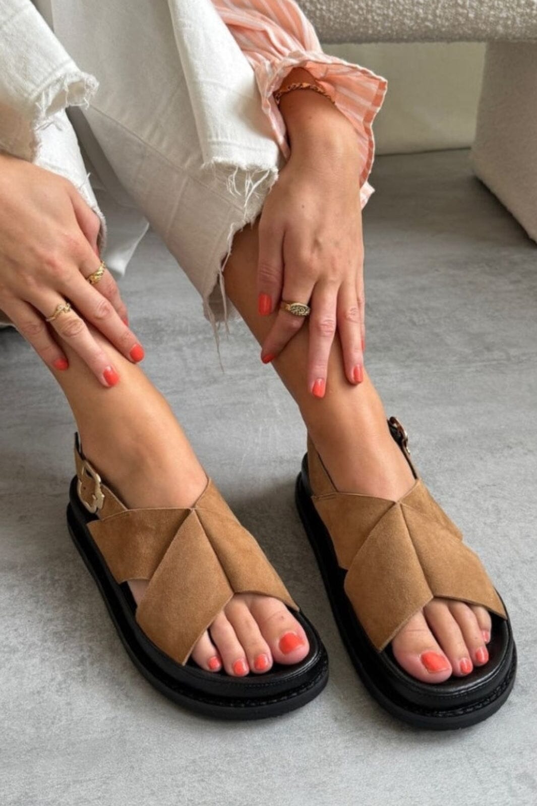 Sandalen von Copenhagen Shoes aus Wildleder und Leder. Die Sandalen haben einen braunen Farbton und ein überkreuztes Design am oberen Teil.