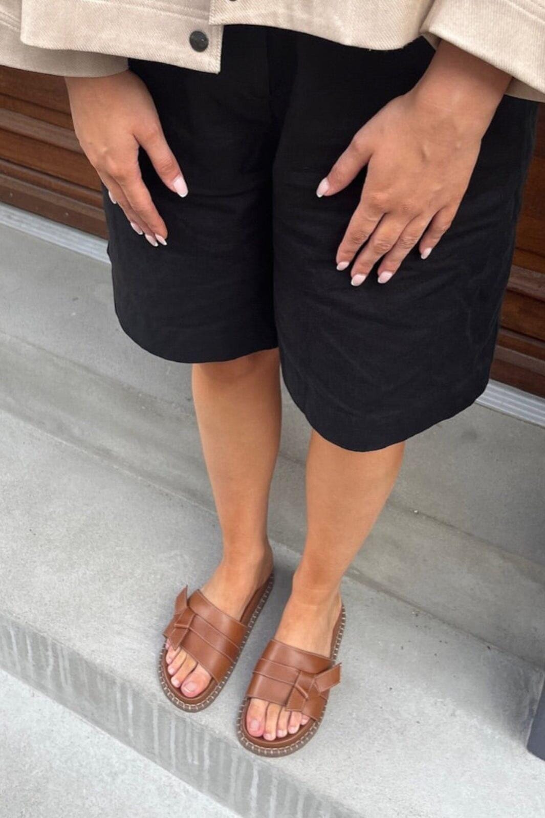 Sandalen von Copenhagen Shoes, aus Leder in einem braunen Cognac-Ton. Die Sandalen haben zwei breite Riemen über dem Fuß und eine dekorative Schleife am oberen Riemen.