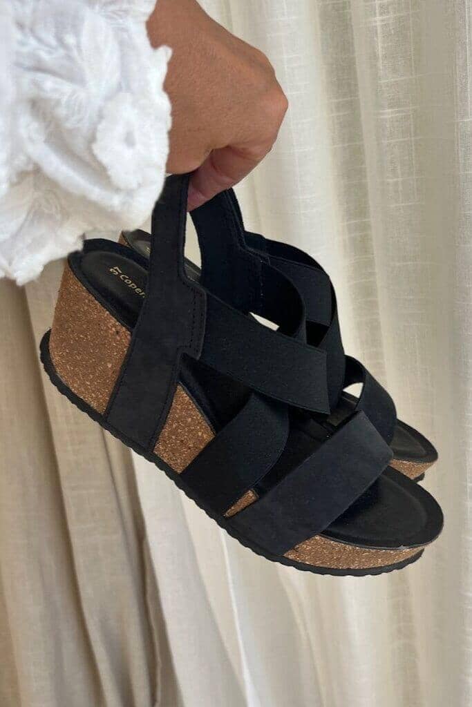 Schwarze Sandale von Copenhagen Shoes mit überkreuzten Riemen aus Nubuk und Elastik. Die Sandale hat eine Korksohle und eine speziell entwickelte Schauminnensohle, die guten Halt für den Fuß bietet.