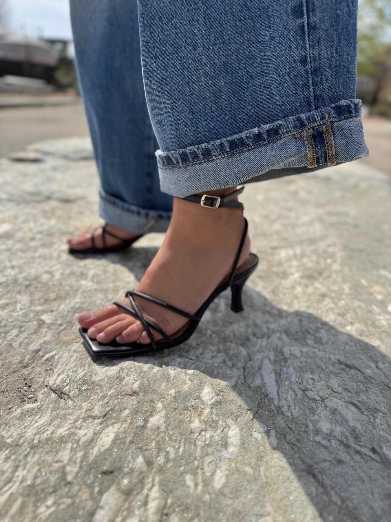 Schwarze Stilettos aus Leder mit überkreuzten Riemen über dem Fuß und einem Knöchelriemen mit Schnalle. Die quadratische Zehenform und der Stiletto-Absatz verleihen den Schuhen ein klares und einfaches Design.