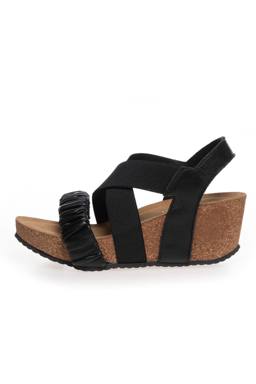 Schwarze Sandalen von Copenhagen Shoes mit Kreuzriemen und korkähnlicher Sohle. Die Sandalen kombinieren Wildleder und Leder mit einem Keilabsatz, der guten Halt bietet.