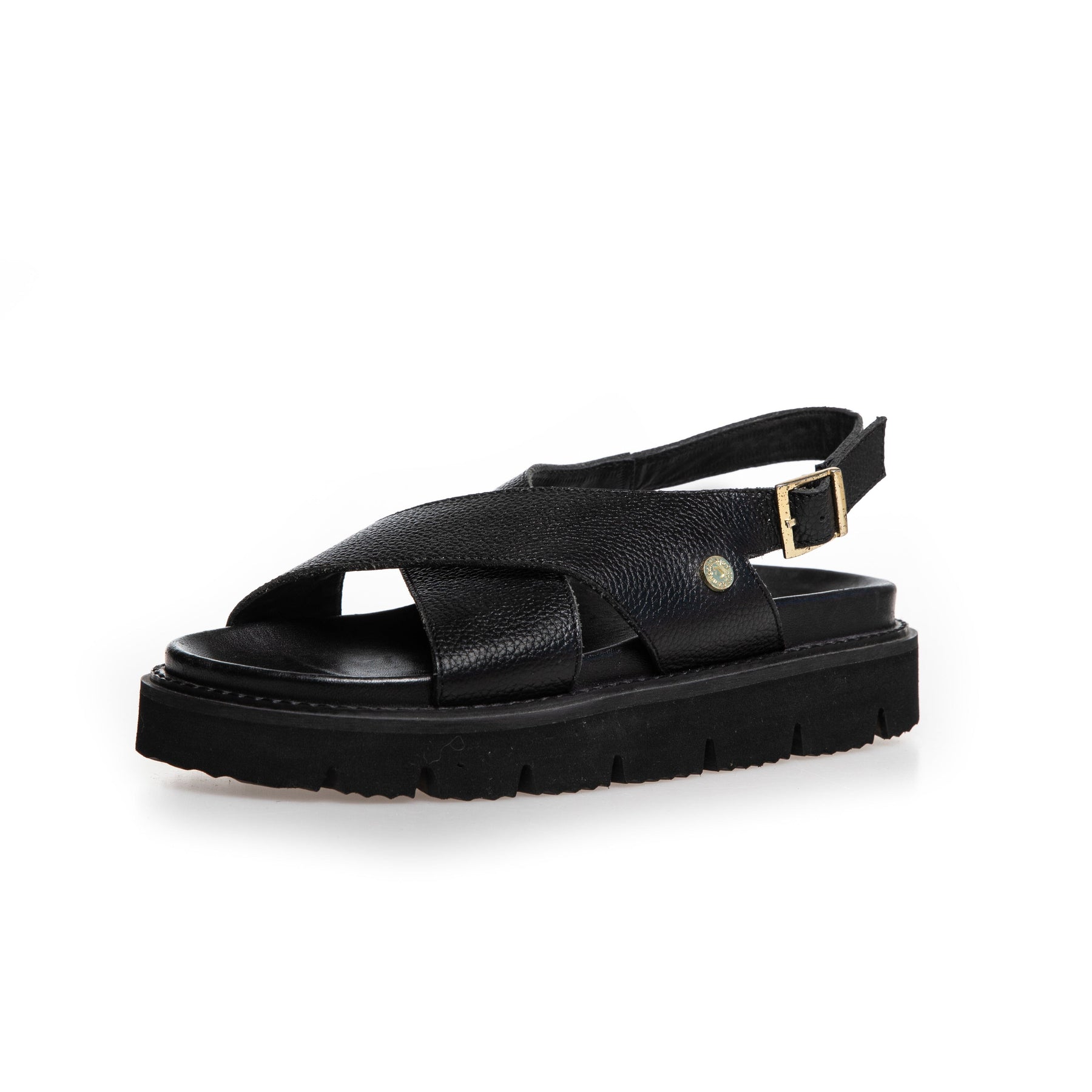 Schwarze Ledersandalen von Copenhagen Shoes mit Kreuzdesign über dem Fuß. Die Sandalen haben eine vergoldete Schnalle am Fersenriemen und EVA-Sohlen mit guter Stoßdämpfung.