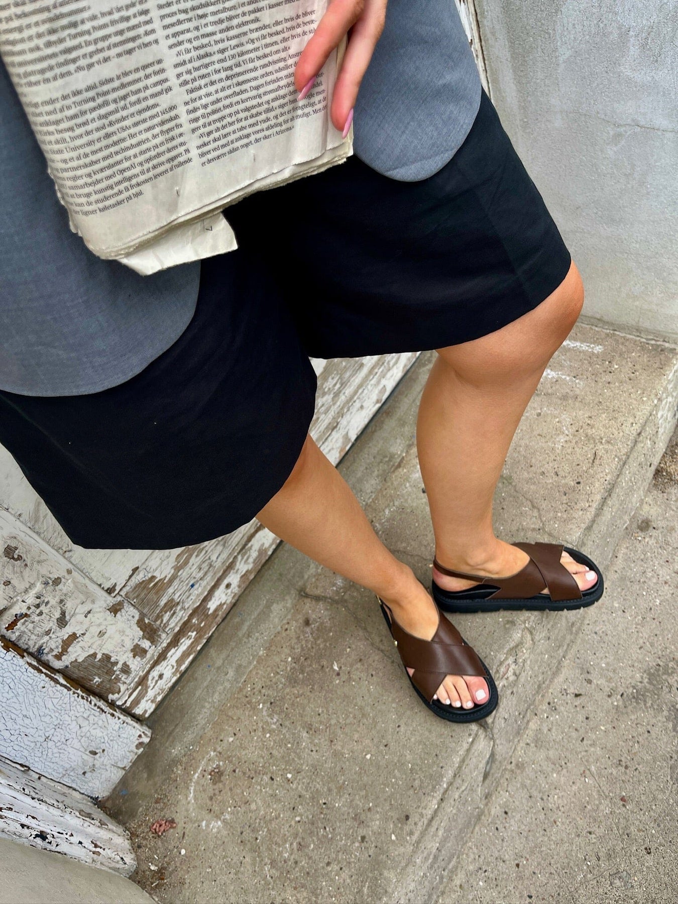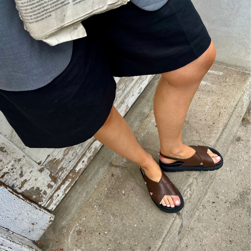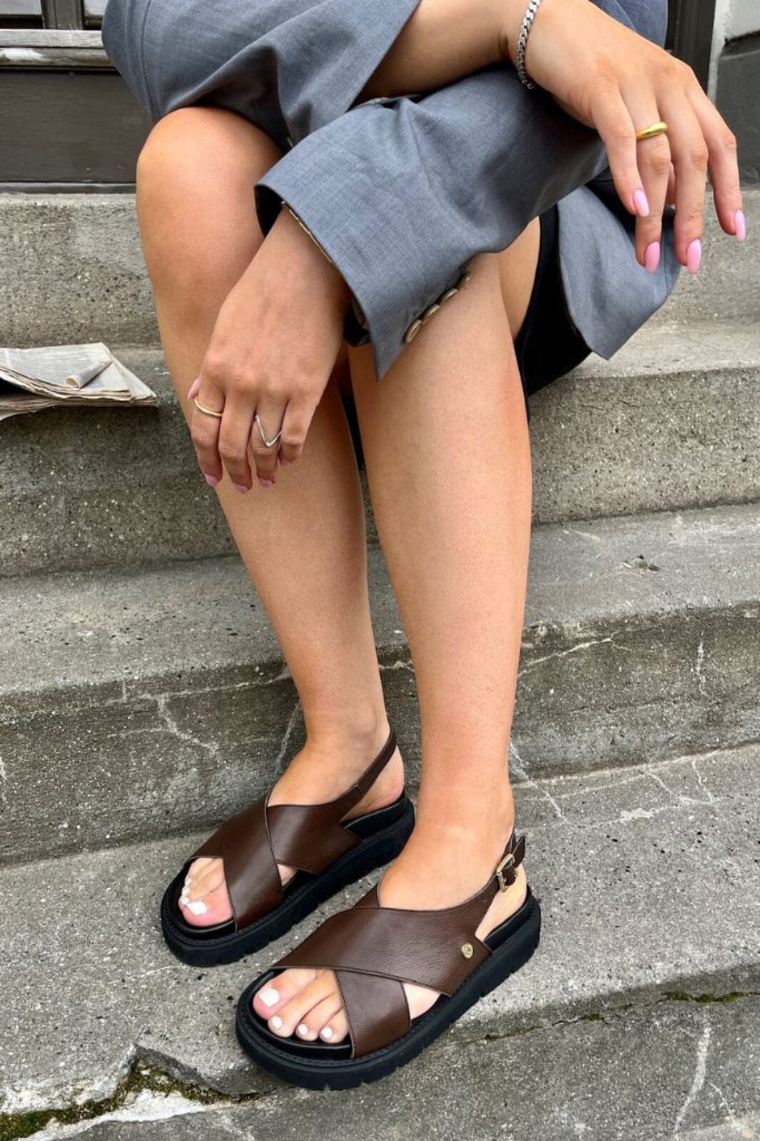 Dunkelbraune Sandale von Copenhagen Shoes mit Kreuzriemen und vergoldetem Schnallenverschluss. Die Sandalen haben eine schwarze chunky EVA-Sohle und sind aus weichem Leder mit einem verstellbaren Fersenriemen gefertigt.