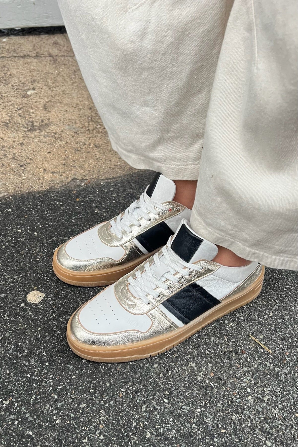Sneaker von Copenhagen Shoes aus silberfarbenem Leder. Der Schuh hat silber- und weißfarbene Partien mit einem schwarzen Streifen an der Seite und einer dicken braunen Sohle.