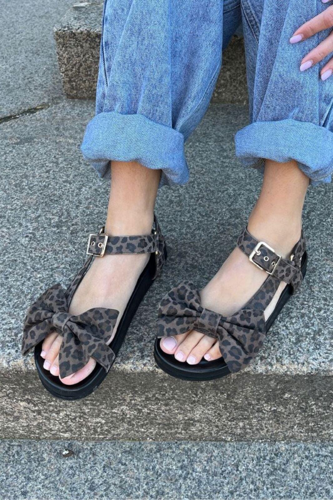 Sandalette von Copenhagen Shoes aus Wildleder und Leder mit Leopardenmuster in der Nuance Mouse. Die große Schleife vorne und der Schnallenverschluss verleihen der Sandalette einen femininen Ausdruck.