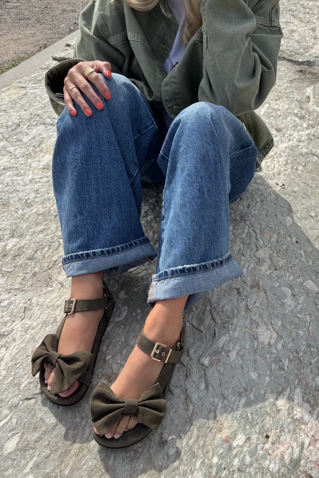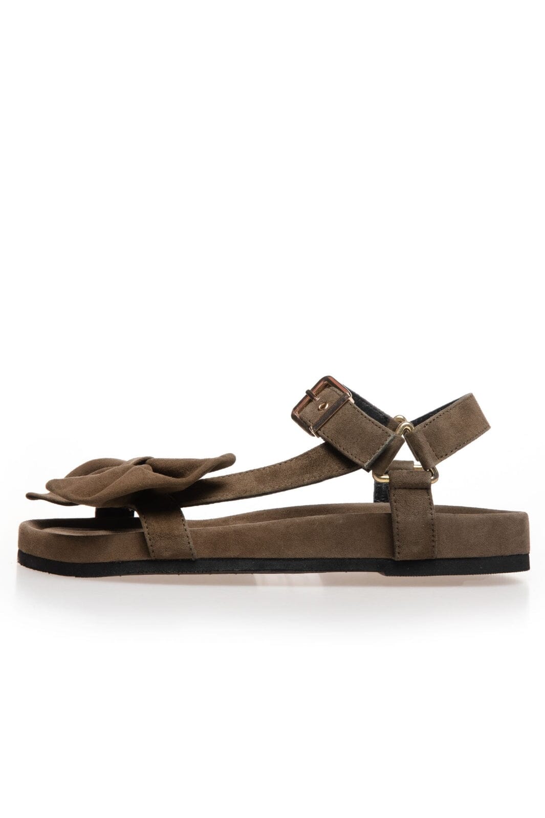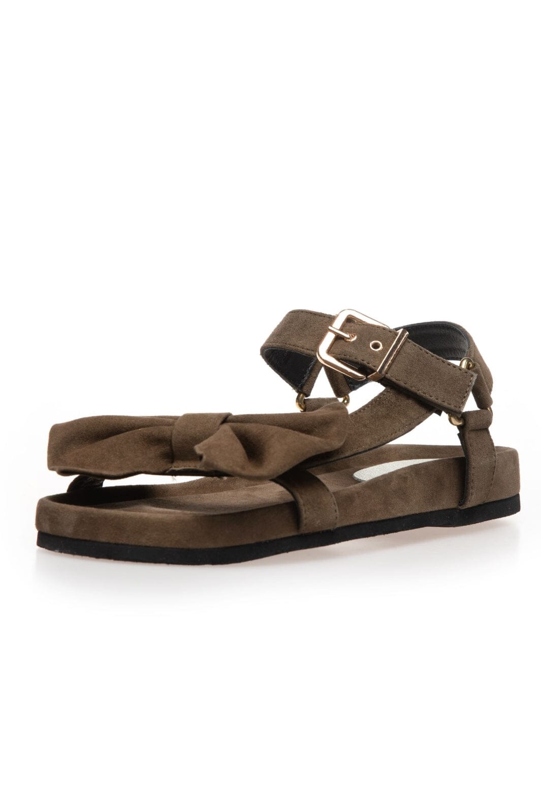 Olivgrüne Sandalen aus weichem Wildleder von Copenhagen Shoes. Die Sandalen haben eine dekorative Schleife auf der Oberseite und einen verstellbaren Knöchelriemen mit goldener Schnalle.