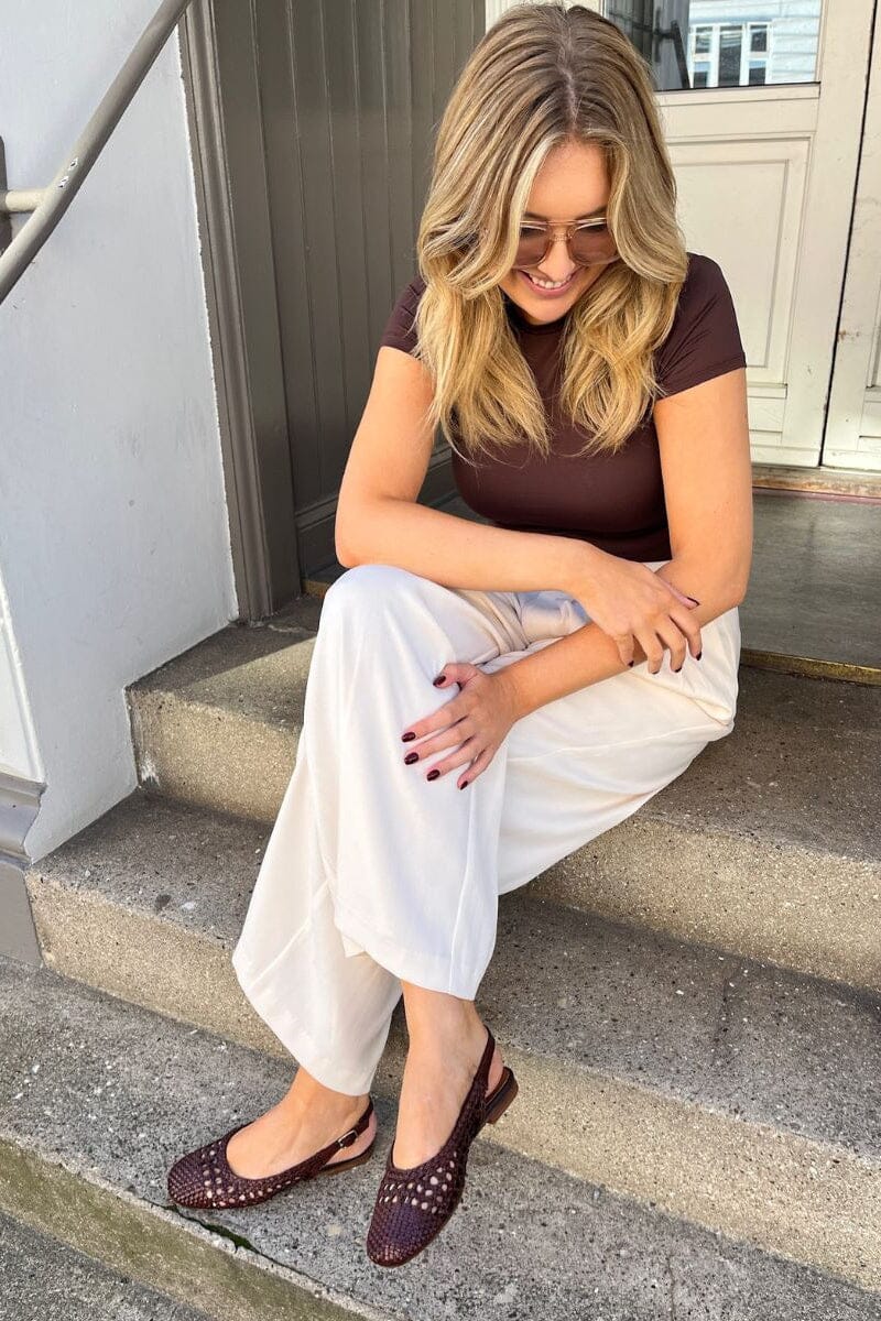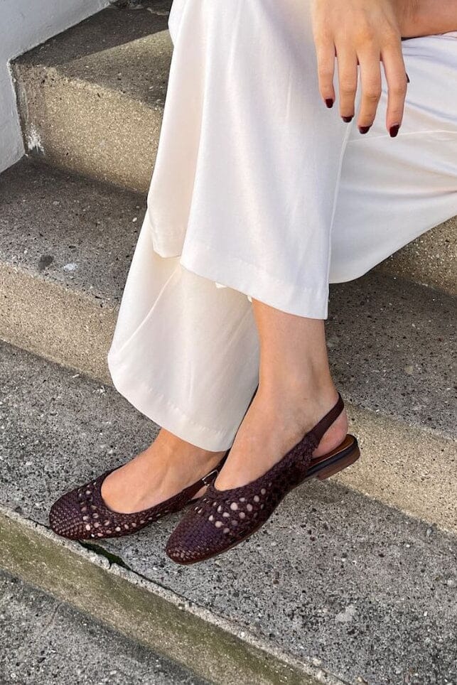 Dunkelbrauner Schuh von Copenhagen Shoes, aus Leder gefertigt. Der Schuh hat ein geflochtenes Design und einen verstellbaren Riemen mit Schnalle.