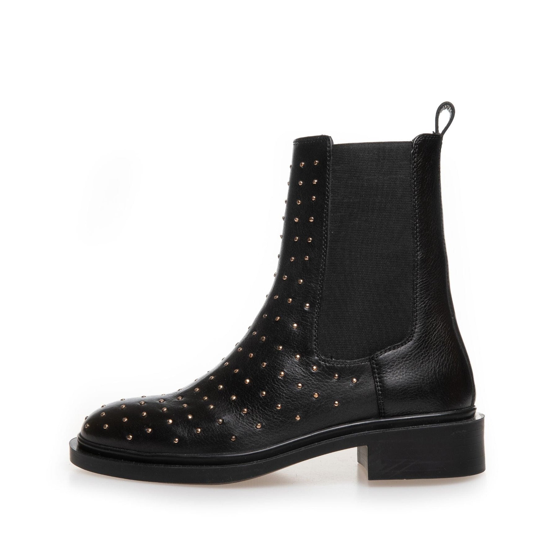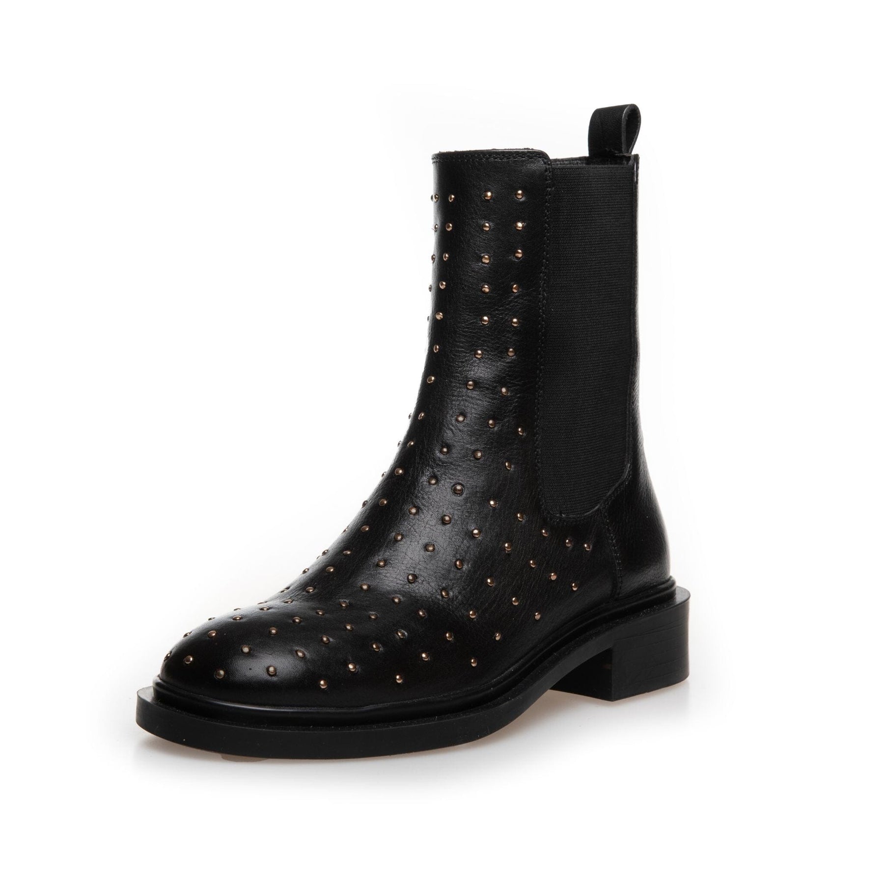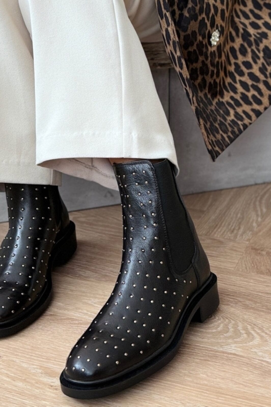 "Schwarze Ankle Boots von Copenhagen Shoes aus Leder mit Nieten und Perlendetails. Die Stiefel haben eine mandelförmige Zehenpartie und einen niedrigen Blockabsatz.
