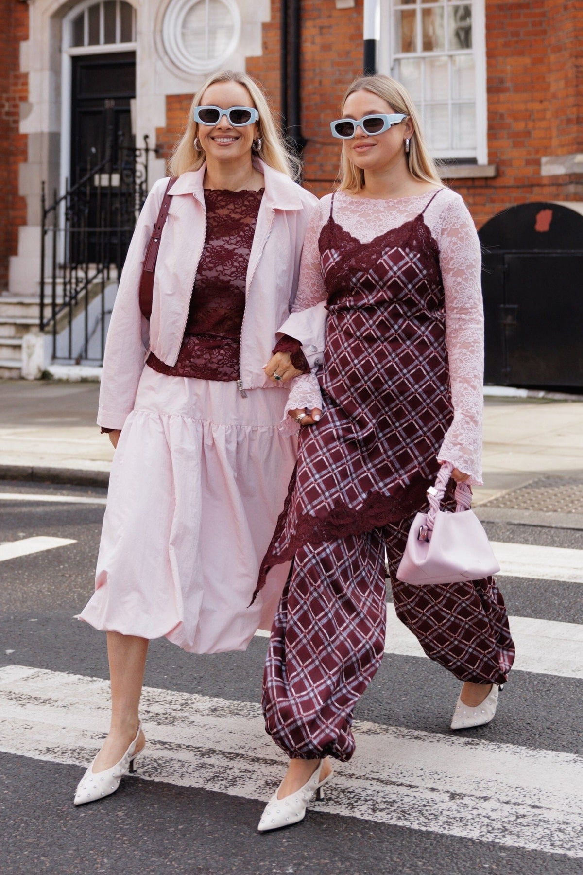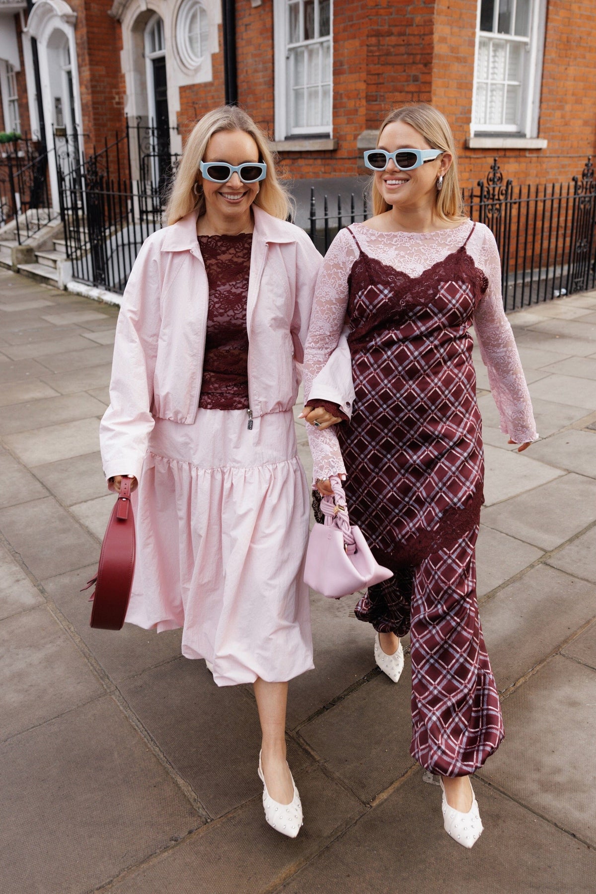 Kleid von Cras mit kariertem Muster in Burgunderrot. Es hat dünne Spaghettiträger und einen asymmetrischen Spitzensaum.